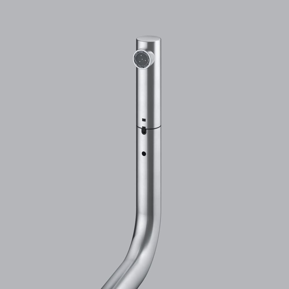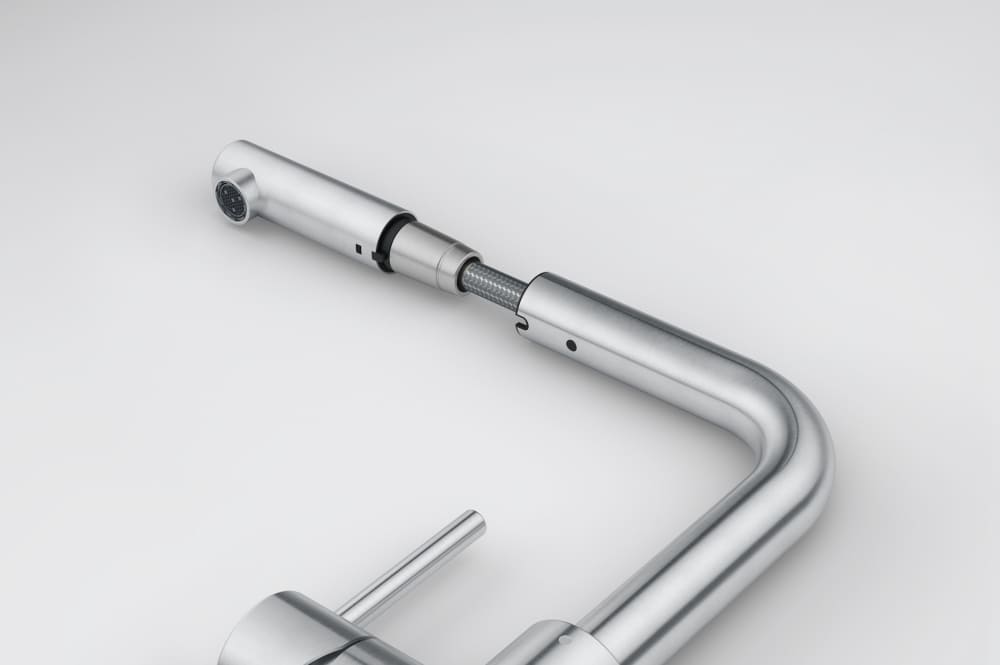 Выдвижной излив в кухонном смесителе — это гибкая трубка из резины в металлической оплетке, расположенная внутри основного излива. Для того, чтобы воспользоваться гибким изливом — например, наполнить высокую посуду, — достаточно включить воду и потянуть за головку, находящуюся на конце трубки.