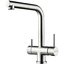 Рычаг для включения фильтрованной воды применяется в современных комбинированных смесителях, где из одного и того же излива подается и водопроводная, и питьевая вода. Такие смесители типа «два в одном» отличаются от обычных тем, что имеют не два подключения, а три, где третье соединяет смеситель с фильтром. Очищенная вода подается по изолированной трубке, проходящей внутри излива. Для удаления накипи, солей металлов, микроорганизмов и прочих вредных примесей могут применяться различные типы фильтров. Проточные фильтры устанавливаются под мойкой и включают несколько картриджей, которые необходимо менять по мере использования. С их помощью можно избавиться от таких примесей, как железо, хлор и многие другие. Устройства с системой обратного осмоса оснащаются диффузором, включающим картриджи для предварительной очистки и осмотическую мембрану, задерживающую практически все вредные примеси.