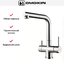 Конструкция двухрычажная: раздельное управление удобно для точной подачи воды. Для питьевой предусмотрен отдельный рычаг, а подача идет по выделенному каналу — фильтрованная вода подводится отдельно, без смешения с бытовой. Излив вращается на 360°, что удобно при смене направления потока между секциями мойки. Аэратор установлен, поток формируется стабильно. Выдвижной излив помогает быстро сполоснуть противни, наполнить высокие кувшины и добраться до углов чаши.