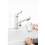 Поворотный излив означает, что вы сможете направить поток воды не только по центру, но и в сторону — и даже с раковины в ванну, если излив достаточно длинный. Угол поворота может быть разным, в зависимости от того получится сдвинуть кран на 180 или 360 градусов. С таким изливом проще мыть посуду и продукты, крупные предметы.