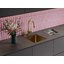 Длиной излива называется расстояние по горизонтали от основания смесителя до точки в раковине, куда падает струя воды. Учитывать длину при выборе смесителя и мойки так же важно, как и высоту. Основной фактор выбора: струя должна попадать в середину раковины, а не на одну из боковых поверхностей, чтобы не забрызгать столешницу и рядом стоящую бытовую технику. В идеале она должна попадать прямо на сливное отверстие, в крайнем случае место падения должно располагаться между сливным отверстием и передней стенкой. При этом нужно учитывать угол, под которым падает струя, а также расстояние от основания смесителя до ближайшей стенки раковины. Проводить измерения следует при максимальном напоре воды.