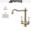 Элегантный смеситель Smeg латунного цвета. Модель однорычажная с ручкой для дозирования фильтрованной питьевой воды. Изделие итальянского производства разработано для интерьеров в традиционном стиле и хорошо сочетается с бытовой техникой, декорированной латунной фурнитурой. Высота излива составляет 22,5 см, благодаря чему смеситель может быть установлен совместно с мойкой значительной глубины. Смеситель можно поворачивать на угол 360 градусов, что способствует удобству использования. Модель оснащена аэратором для обогащения воды воздухом: он позволяет снизить расход воды и шум при ударе струи о дно мойки.
