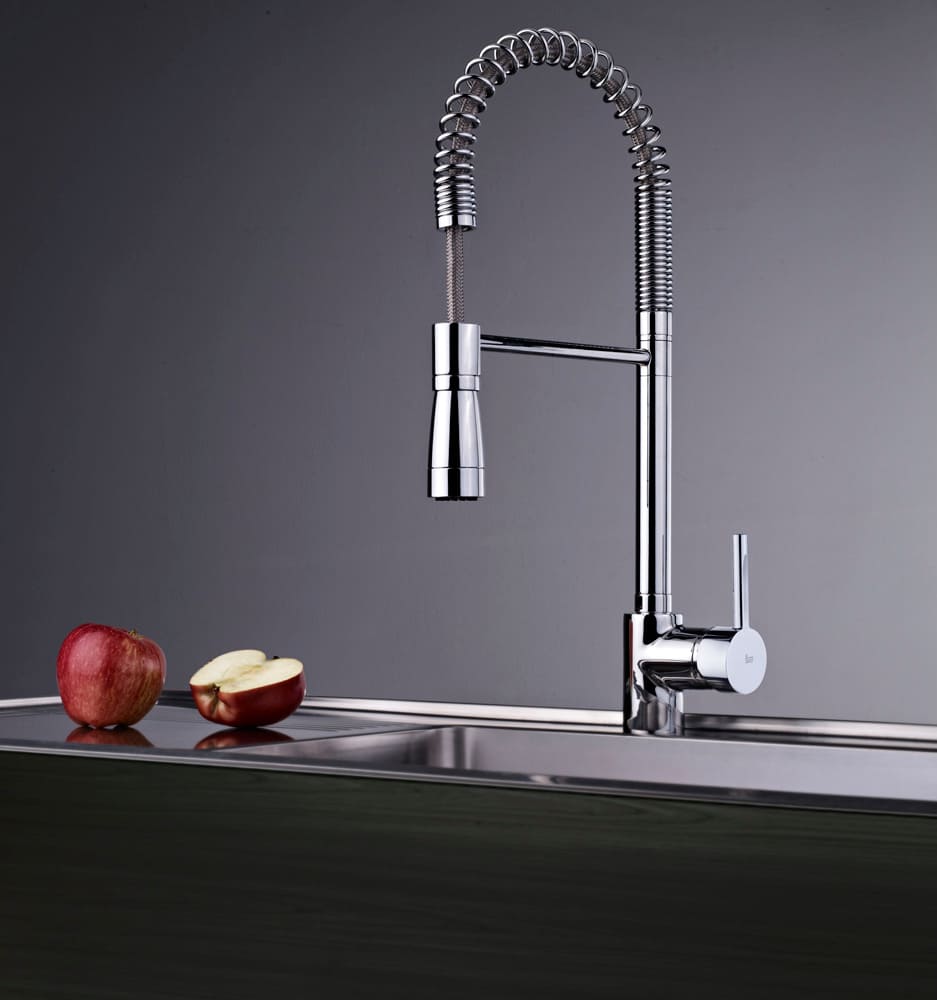 Выдвижной излив в кухонном смесителе — это гибкая трубка из резины в металлической оплетке, расположенная внутри основного излива. Для того, чтобы воспользоваться гибким изливом — например, наполнить высокую посуду, — достаточно включить воду и потянуть за головку, находящуюся на конце трубки.