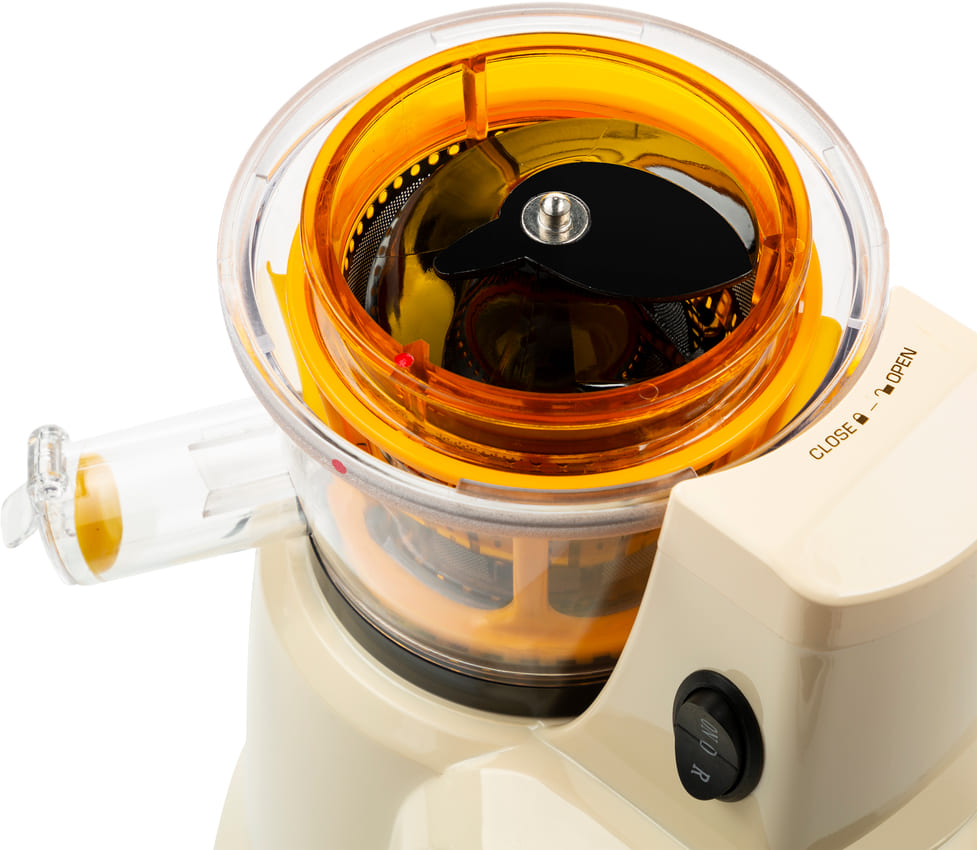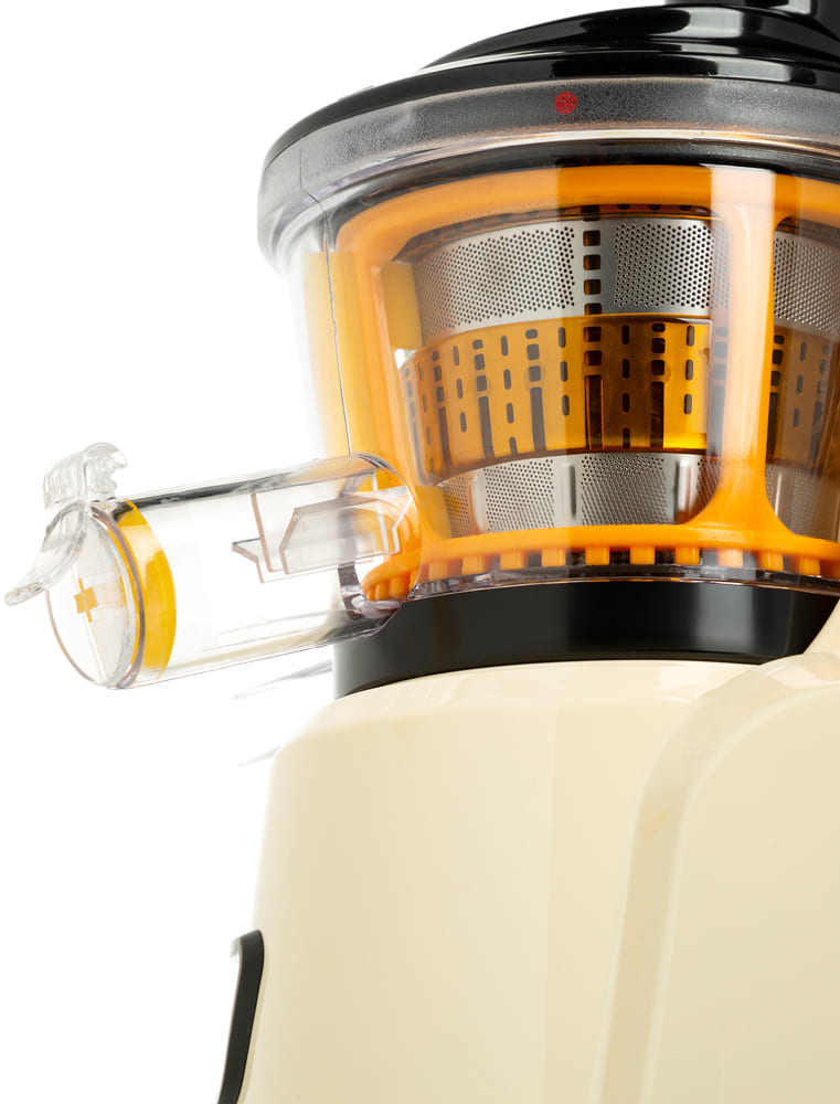 Технические решения направлены на удобство эксплуатации и качество сока. Мощность 150 Вт в сочетании со скоростью 50 об/мин обеспечивает щадящий режим отжима, который помогает сохранять витамины и аромат плодов. Одна рабочая скорость делает управление простым и понятным, а функция реверс помогает быстро устранить застрявшие кусочки плодов. Система прямой подачи и антикапельный механизм упрощают налив сока в емкость и защищают поверхность от подтеков.