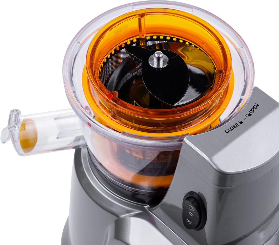 Универсальность проявляется в сочетании принципов отжима и шнековой подачи, что расширяет возможности по обработке фруктов и овощей. Мощность 150 Вт и низкая скорость шнека 50 об/мин снижают нагрев сока и помогают сохранить витамины и аромат. Одна рабочая скорость и механическое управление упрощают эксплуатацию, а функция реверс помогает справляться с засорами. Диаметр горловины 40 мм требует предварительной нарезки крупных плодов, но обеспечивает аккуратную подачу и безопасность.