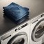 Уход за ней имеет свои особенности — в частности, вещи из денима отличаются высокой прочностью, но даже при добавлении эластана или лайкры часто могут садиться в длину. Кроме того, порошок при недостаточно хорошем полоскании может оставаться в многочисленных толстых швах, что ведет к появлению характерного запаха, а в некоторых случаях — и к развитию аллергических реакций, поэтому лучше использовать для стирки джинсовых вещей жидкие моющие средства.