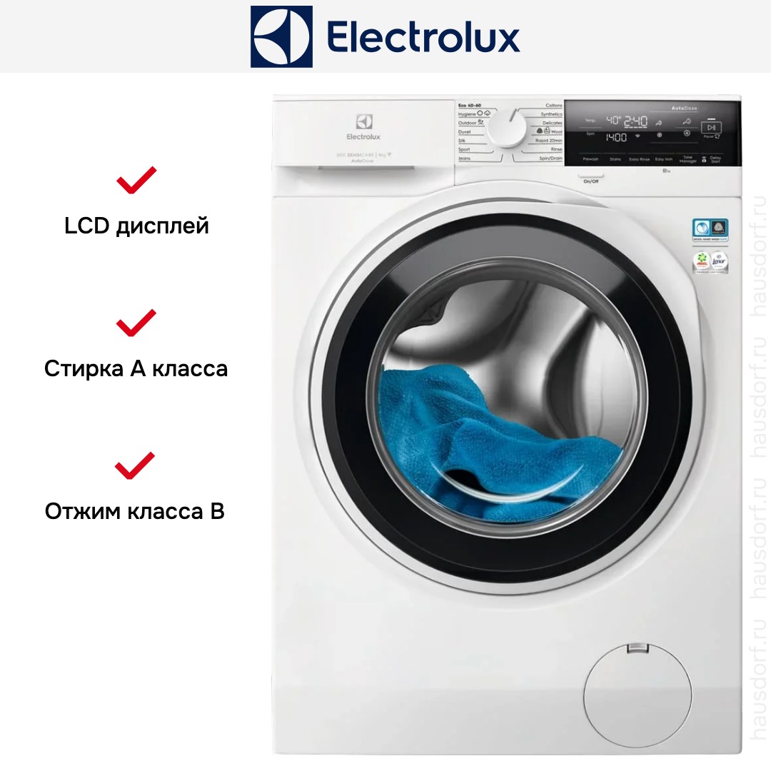 Electrolux EW6F3494ACE Сочетая строгие линии и аккуратную цветовую гамму, эта стиральная машина предлагает продуманный дизайн, в котором белый корпус и контрастный чёрный люк создают современный акцент без излишней помпезности; габариты 84,7×59,7×63,6 см делают агрегат удобным для размещения в стандартных нишах, а регулируемые ножки позволяют без труда выровнять оборудование на даже неровном полу. Панель управления представлена сочетанием поворотного программатора и сенсорных кнопок с LED-дисплеем, индикацией температуры, скорости отжима, дополнительного полоскания, блокировки от детей и веса загруженного белья — всё это упрощает настройку и моментально информирует о выбранных параметрах. Барабан объёмом 69 л и максимальная загрузка до 9 кг позволяют постирать большие объёмы за один цикл, включая тяжёлые вещи и одеяла; материал внутренней поверхности — нержавеющая сталь — гарантирует долговечность и бережное обращение с тканями. Инверторный мотор обеспечивает стабильную работу при скорости отжима до 1400 об/мин, при этом класс энергопотребления A+++ и экономичное потребление 1,65 кВт·ч за цикл делают прибор выгодным в эксплуатации, а расход воды в 85 л за цикл остаётся оптимальным для интенсивных программ. Среди интеллектуальных решений выделяются AutoDose для автоматического дозирования моющего средства и функция автоматического взвешивания белья, которые вместе с системой SensiCare и TimeManager дают гибкие сценарии для экономии ресурсов и бережного ухода: можно выбрать деликатный режим для шерсти и шёлка, программу для джинсов, спортивной одежды или верхней одежды, гигиеническую стирку против аллергии, а также режим без отжима и экспресс-циклы для быстрого освежения. Для тех, кто ценит комфорт, предусмотрена возможность отложенного старта от 1 до 20 часов, сигнал об окончании и дополнительное полоскание; контроль пенообразования и встроенная сервисная диагностика помогают сохранять технику в рабочем состоянии, а частичная защита от протечек и защита от детей обеспечивают безопасность в доме. В числе функций по уходу присутствует режим с паром для освежения и разглаживания, возможность стирки громоздких изделий и отдельные программы для синтетики и хлопка; три стандартных направления работы объединены с пользовательскими настройками температуры и длительности. Удобство обслуживания повышают четыре отделения для моющих средств, длина сетевого кабеля 180 см и возможность регулировать параметры через Wi-Fi и управление со смартфона, что превращает управление в интуитивное и удалённое: проверить статус, запустить цикл или скорректировать параметры можно без подхода к панели. Аппарат рассчитан на стандартное напряжение 220-240 В и частоту 50-60 Гц, потребление мощности до 2100 Вт, при этом уровень шума при отжиме — 75 дБ, что характерно для мощных режимов. Внешне прибор выглядит аккуратно и современно, а сочетание практичных характеристик и интеллектуальных опций делает его подходящим решением для семей, которым важны ёмкость, экономичность и широкий набор программ для ухода за разными типами тканей.
