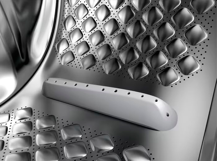 Барабан обычно изготавливается из тонкой нержавеющей стали, отверстия на боковой поверхности могут располагаться по-разному и иметь разную форму. Поверхность барабана в большинстве моделей не является гладкой: на ней находятся выпуклости и впадины для лучшего скольжения белья.