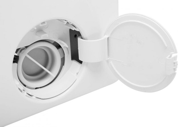 Модели с вертикальной загрузкой отличает надежное крепление барабана на двух валах. Еще одно их отличие — особая конструкция люка: на нем имеется отверстие, закрывающееся на замок. Чтобы получить доступ к барабану, необходимо открыт его и отодвинуть створку.