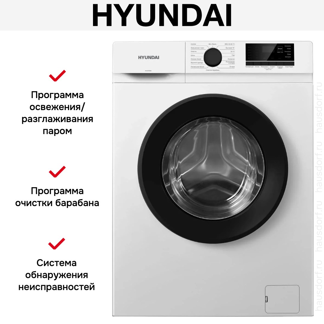 Стиральная машина Hyundai WME7208 — компактный и эргономичный прибор для домашнего использования, который сочетает в себе строгий дизайн и продуманные технические решения. Белый корпус и контрастный чёрный люк подчёркивают современный стиль и легко вписываются в любую кухню или санузел. Габариты 84×60×45 см делают аппарат удобным для размещения в нишах или рядом с мебелью, а угол открытия дверцы 120° и диаметр люка 30 см обеспечивают удобство загрузки и выгрузки белья.