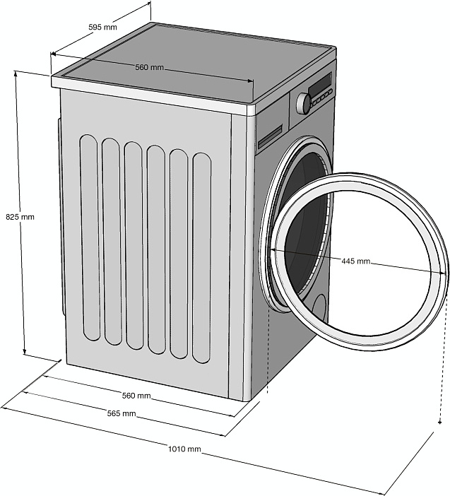 У наиболее распространенных стиральных машин с фронтальной загрузкой стандартная ширина составляет 59-60 см. Это относится как к отдельно стоящим, так и к встраиваемым моделям, в том числе с установкой под столешницу. Такие устройства считаются полноразмерными.