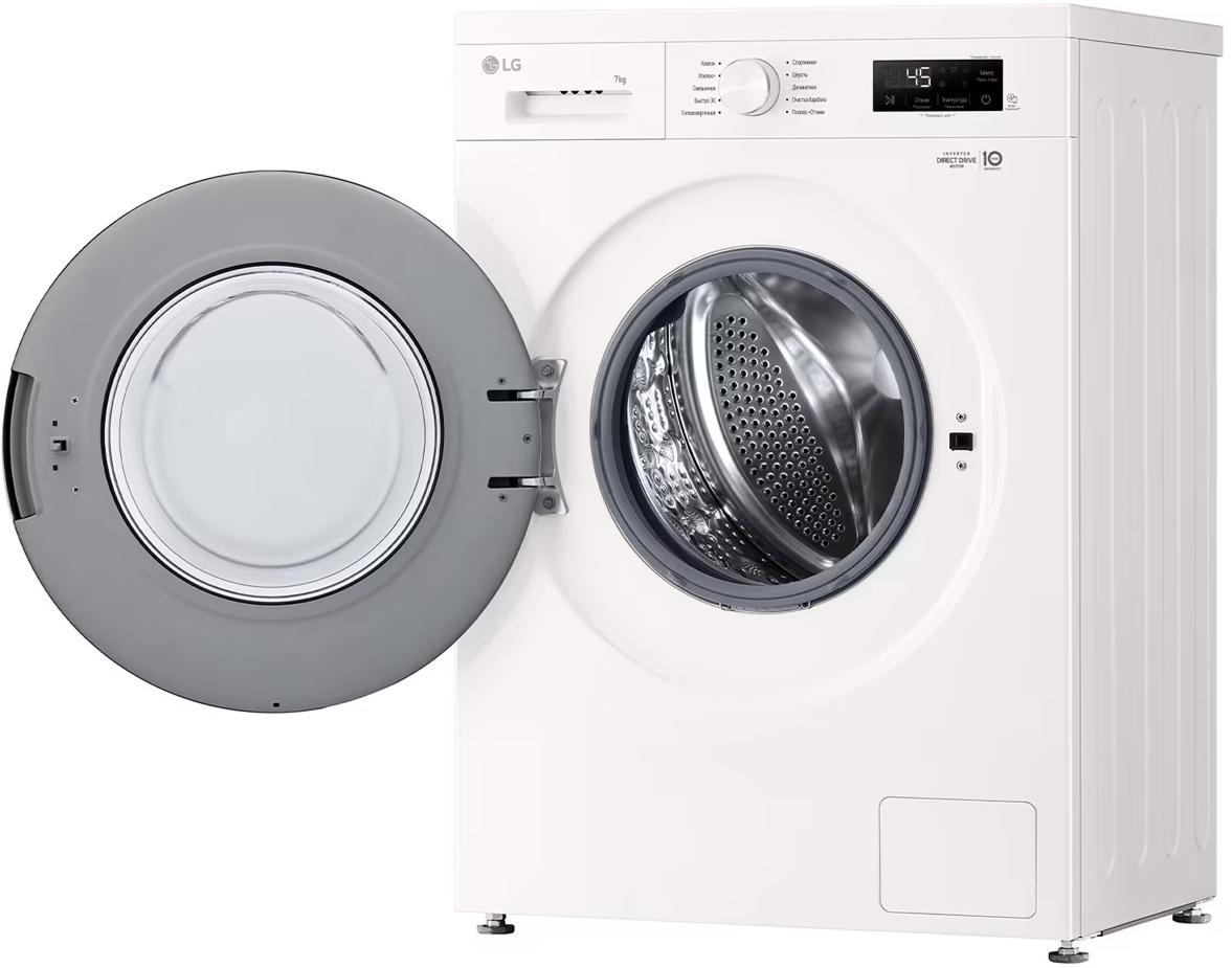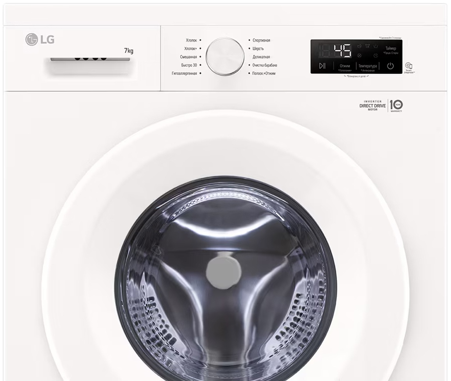 Цвет этой стиральной машинки — белый. Мотор: Инверторный. Благодаря ему машина работает тише, потребляет меньше электроэнергии, сохраняя при этом необходимую мощность.