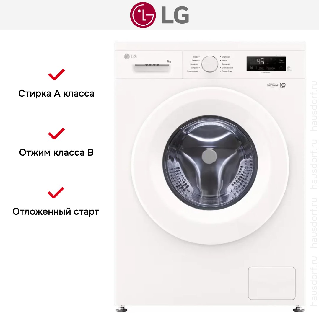 Набор программ охватывает 10 режимов, включая хлопок, смешанное белье, деликатную и шерсть, а также экспресс-стирки 30 и 15 минут. Есть специальные циклы для гипоаллергенной гигиенической обработки, предварительной стирки и спортивной одежды, а также опция Полоскание+Отжим и режим Хлопок+. Функция пара Steam™ обновляет вещи и облегчает разглаживание, а возможность добавить белье во время цикла повышает удобство использования. Дополнительные технологии включают авто-взвешивание, датчик уровня воды, контроль пенообразования и дисбаланса, защиту от протечек, блокировку от детей и защиту при скачках напряжения, а также мобильную диагностику Smart Diagnosis™ для быстрого выявления неисправностей.