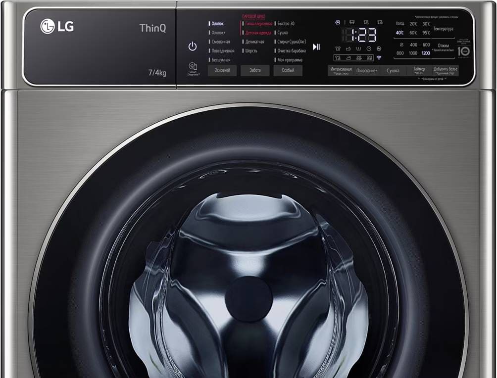 Эта модель — комбинация стирки и сушки, что полезно людям, которые не могут или не хотят приобретать отдельно сушильную машину, при этом в квартире нет балкона или лоджии, чтобы с комфортом сушить одежду на веревках. Вы можете отложить запуск, если хотите сэкономить на тарифах и включить машинку ночью, либо если планируете развесить белье сразу после возвращения работы и не ждать, пока закончится цикл. На панели управления отображаются разнообразные индикаторы, чтобы было проще следить за процессом, например: хода программы, температуры стирки, скорости отжима, времени до окончания стирки, выбора дополнительных функций, блокировки дверцы, выбранной программы, включения и выключения, старт/пауза, отсрочки старта, дополнительного полоскания. Скорость отжима достигает 1200 оборотов в минуту. Функцию отжима можно будет отключить вручную, если она вам не нужна.