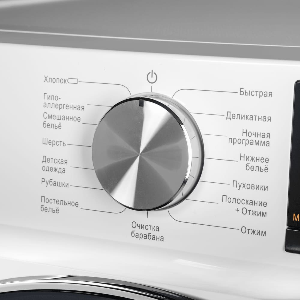 Электронное управление удобно и понятно. Для выбора программ используются кнопки, поворотный программатор. Количество режимов для стирки разных типов белья: 16.