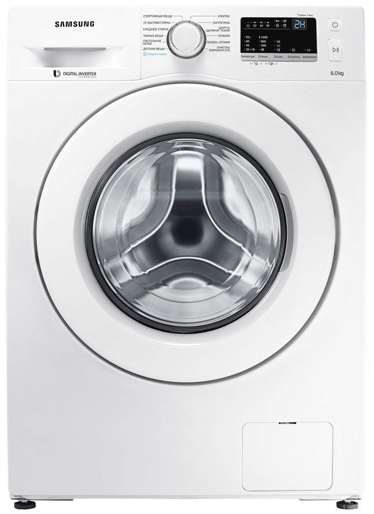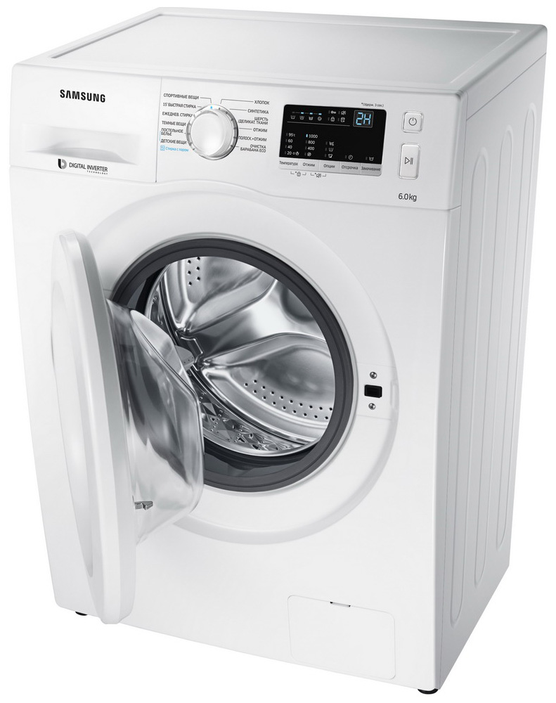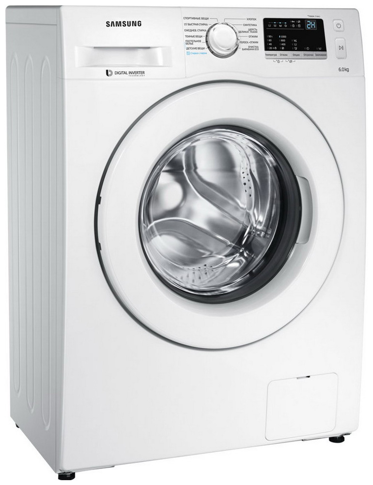 Цвет этой стиральной машинки — белый. В данной модели Samsung используется барабан Diamond. Мотор: Инверторный. Благодаря ему машина работает тише, потребляет меньше электроэнергии, сохраняя при этом необходимую мощность.