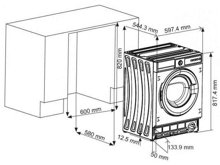 Машина размещается в нише, образованной столешницей и стенками рядом стоящей мебели так, чтобы сбоку оставался зазор не менее 1 см с каждой стороны. Сзади также должно оставаться свободное пространство для легкого доступа к шлангам.