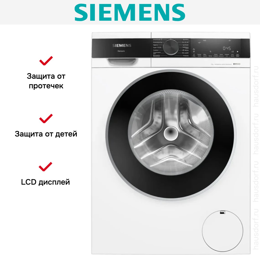 Стиральная машина Siemens WG44G2FWPL имеет стильный дизайн с белым корпусом и контрастным чёрным люком, что делает её органичной в любом современном интерьере. Внешний вид продуман до мелочей: наклонная панель для удобного доступа к органам управления и крупный цифровой дисплей упрощают выбор программ и их контроль. Боковые стенки антивибрационной конструкции уменьшают тряску при отжиме, что не только делает работу тише, но и снижает нагрузку на механизм.
