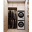 Встраиваемые устройства в абсолютном большинстве имеют фронтальную загрузку. Преимущество встроенной техники заключается в экономии места и удобстве выбора: при установке не нужно специально подбирать модель под интерьер помещения. Покупатель может выбрать устройства полностью или частично встраиваемое. Полностью встраиваемые модели закрываются декоративной мебельной дверцей, в связи с этим фасад и панель управления у них не имеют выступающих частей. Такие машины отличаются пониженным уровнем шума за счет дополнительной звукоизоляции, но несколько меньшим объемом барабана. Специальные крепления помогают установить прибор в тумбе и навесить дверцу. Основным недостатком подобных устройств считается высокая стоимость — однако она окупается надежностью и долгим сроком эксплуатации. Частично встраиваемые машины могут устанавливаться под столешницу или под раковину и размещаться не только в кухне, но и в ванной, не занимая много места.