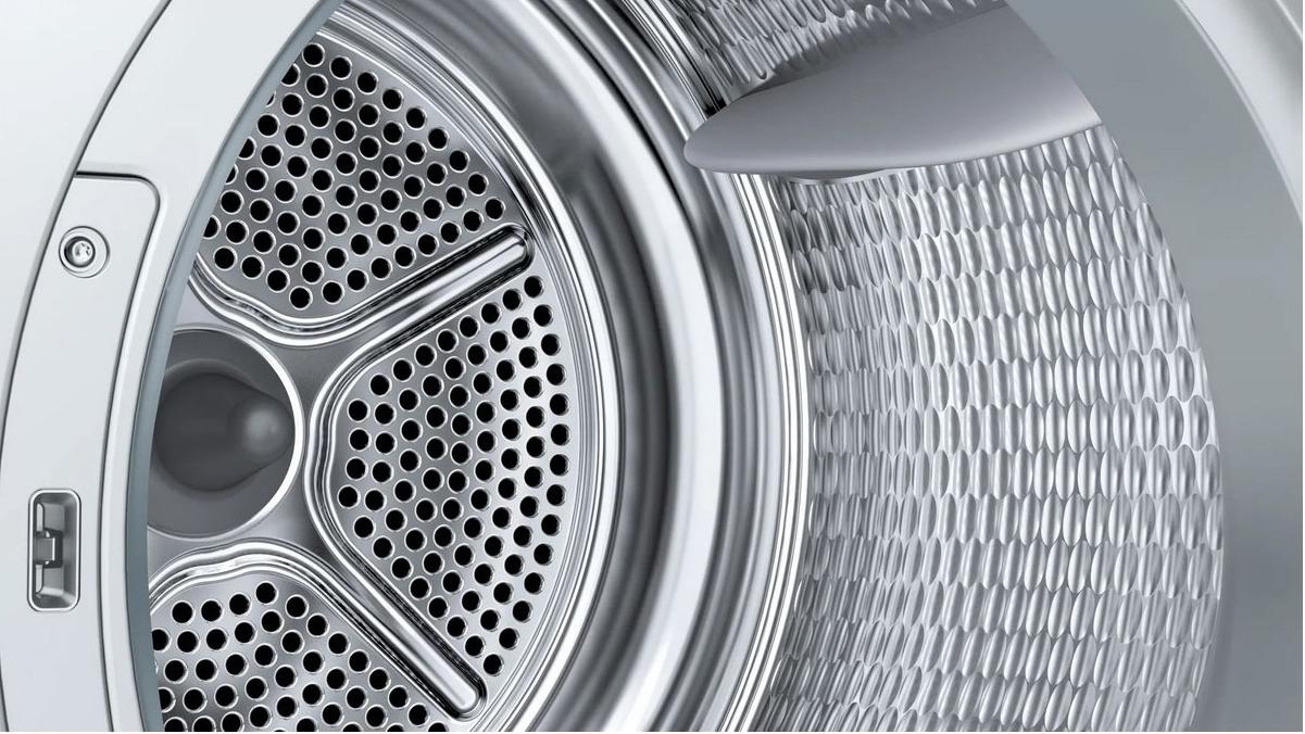 AntiVibration Design в сушильных машинах Bosch — особая конструкция боковых стенок, которая разработана для уменьшения уровня шума и максимальной защиты от вибрации. Благодаря форме стенок жесткость корпуса увеличивается, и машина вибрирует намного меньше даже при сушке на высокой скорости.