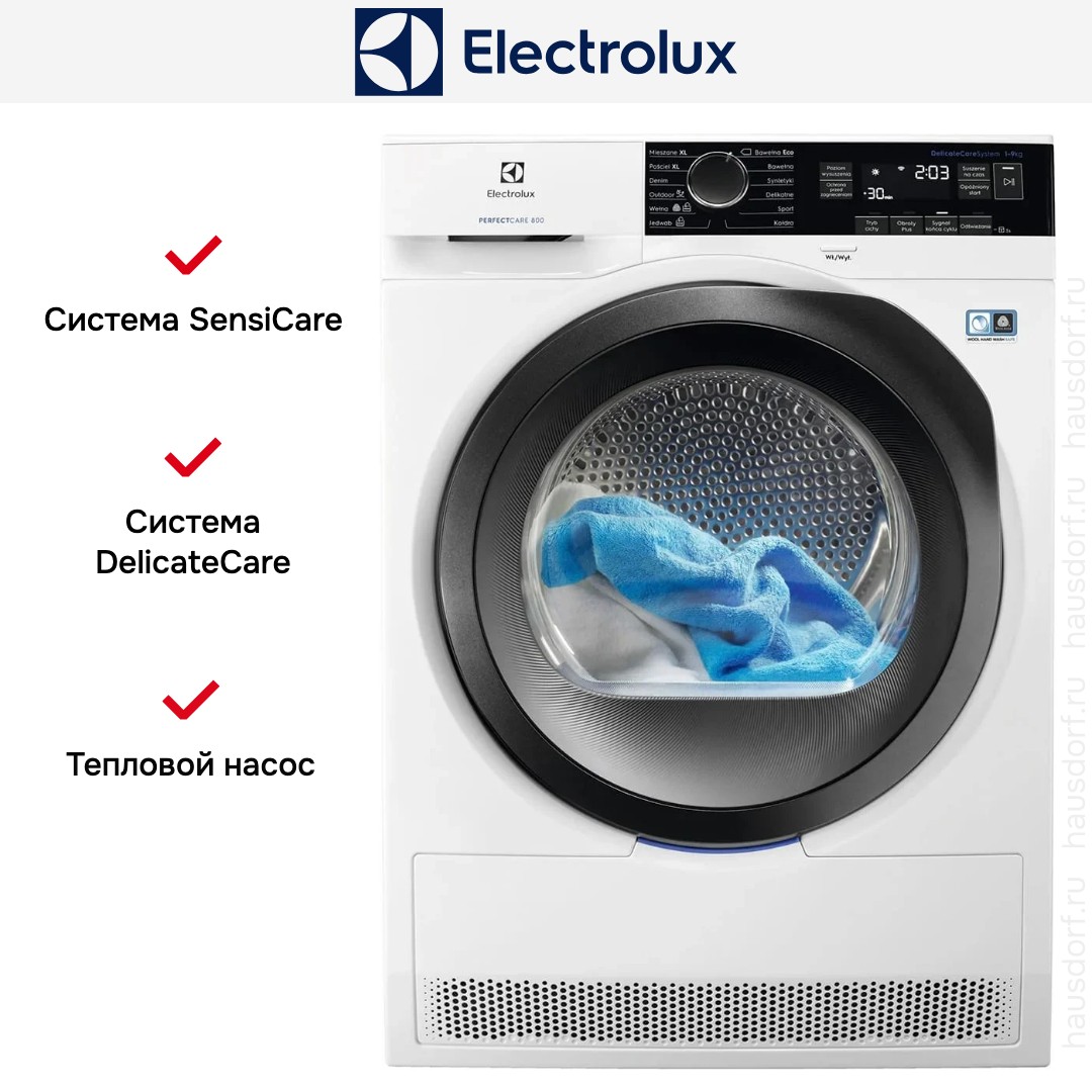 Благодаря системе SensiCare машины Электролюкс справляются с сушкой любых тканей, в том числе шерстяных: это подтверждает специальный сертификат Woolmark. Подобной технологией оснащаются и устройства других брендов премиального уровня: так, система SensorIQ используется в сушильных машинах производства словенской компании Gorenje.