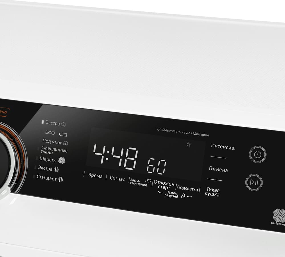 Вы можете самостоятельно выбрать время, которое будет длиться программа, но нужно тщательно рассчитать его — обычно проще воспользоваться предложенными вариантами. Возможность сохранить индивидуальные настройки облегчает и ускоряет запуск последующих циклов. Используйте также параметры остаточной влажности, в данной модели есть следующие: под утюг, в шкаф, экстрасушка — они позволяют точно определить, каким вы достанете белье из барабана.