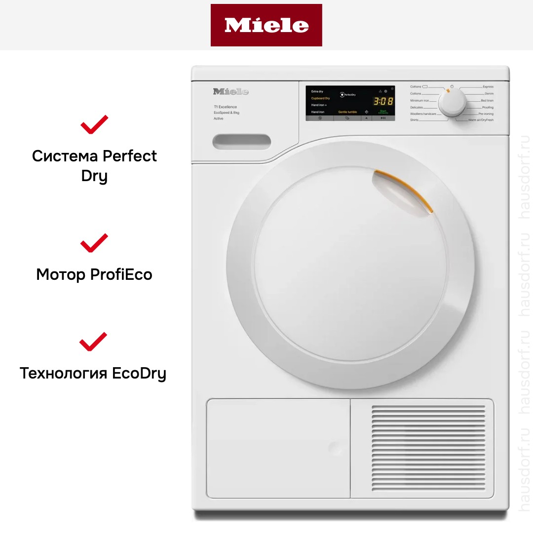 Запатентованная гарантирует согласованную работу и автоматическую очистку теплообменника и фильтра, так что пользователю не нужно беспокоиться и следить за степенью засорения теплообменника ворсом, а затем извлекать и прочищать его вручную, что также занимает значительное время. Таким образом удается поддерживать короткие рабочие циклы для сушки белья из ткани любого вида, а значит, и экономить электроэнергию: срок службы машины при этом не имеет значения. Все сушильные машины Miele, оснащенные технологией EcoDry, относятся к наивысшему классу энергоэффективности А+++.