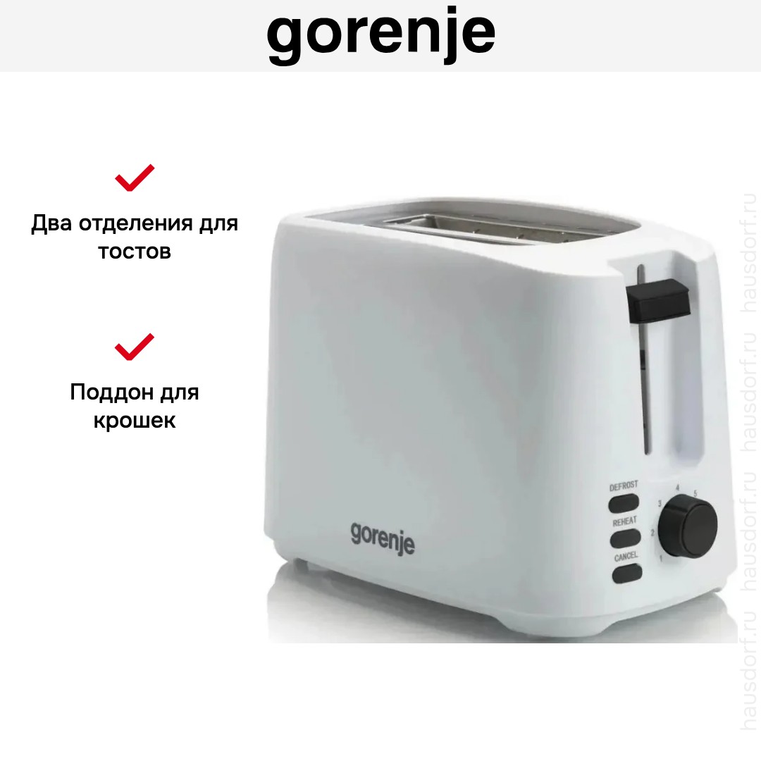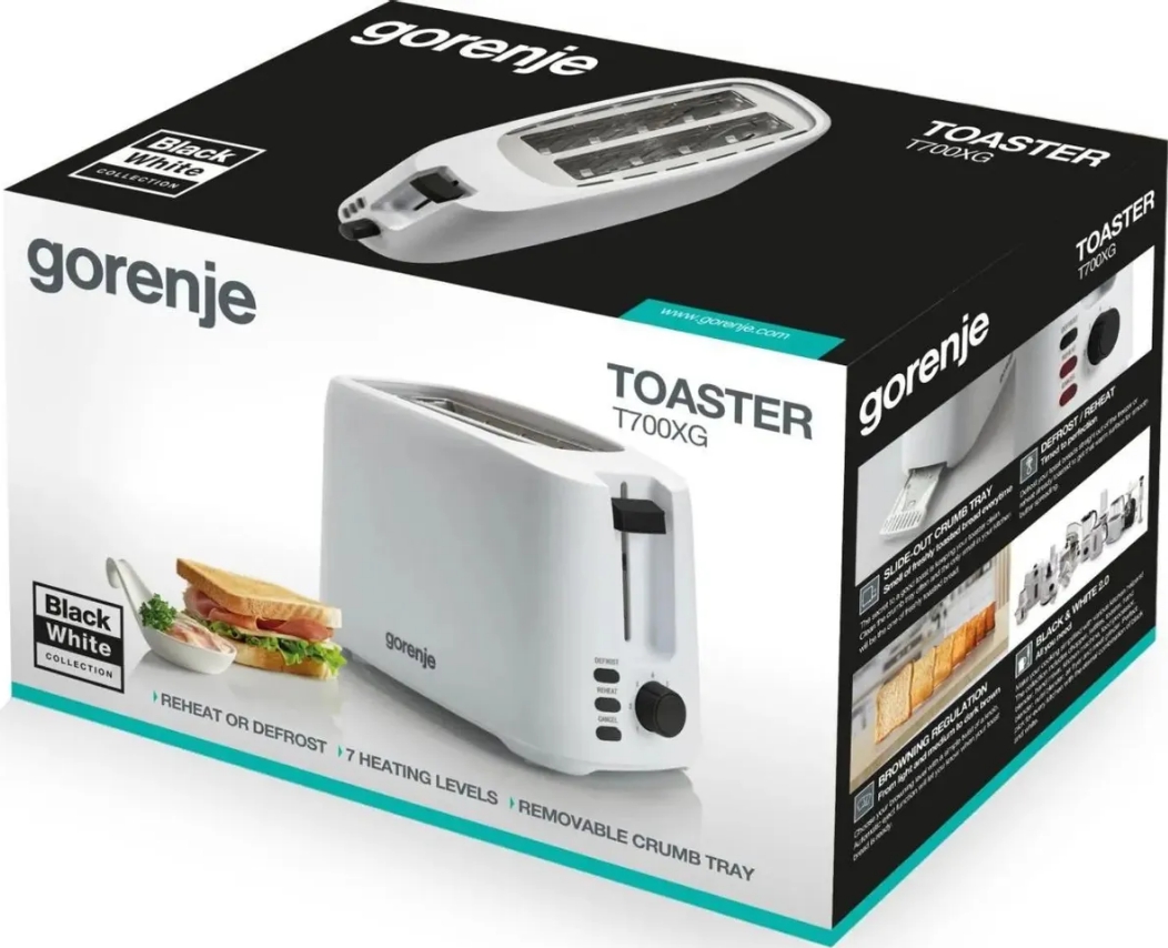 Тостер Gorenje T700XG — стационарный прибор в лаконичном белом исполнении с пластиковым корпусом и термоизолирующей облицовкой. Его компактные габариты 16.4 × 24.8 × 15.6 см и масса около 0.9 кг делают устройство незаметным на столешнице. Материал корпуса обеспечивает лёгкость и простоту ухода, а термоизоляция снижает нагрев внешних поверхностей в процессе работы. Минималистичный силуэт в светлом цвете легко впишется в современную кухню и не будет спорить с другой техникой.