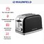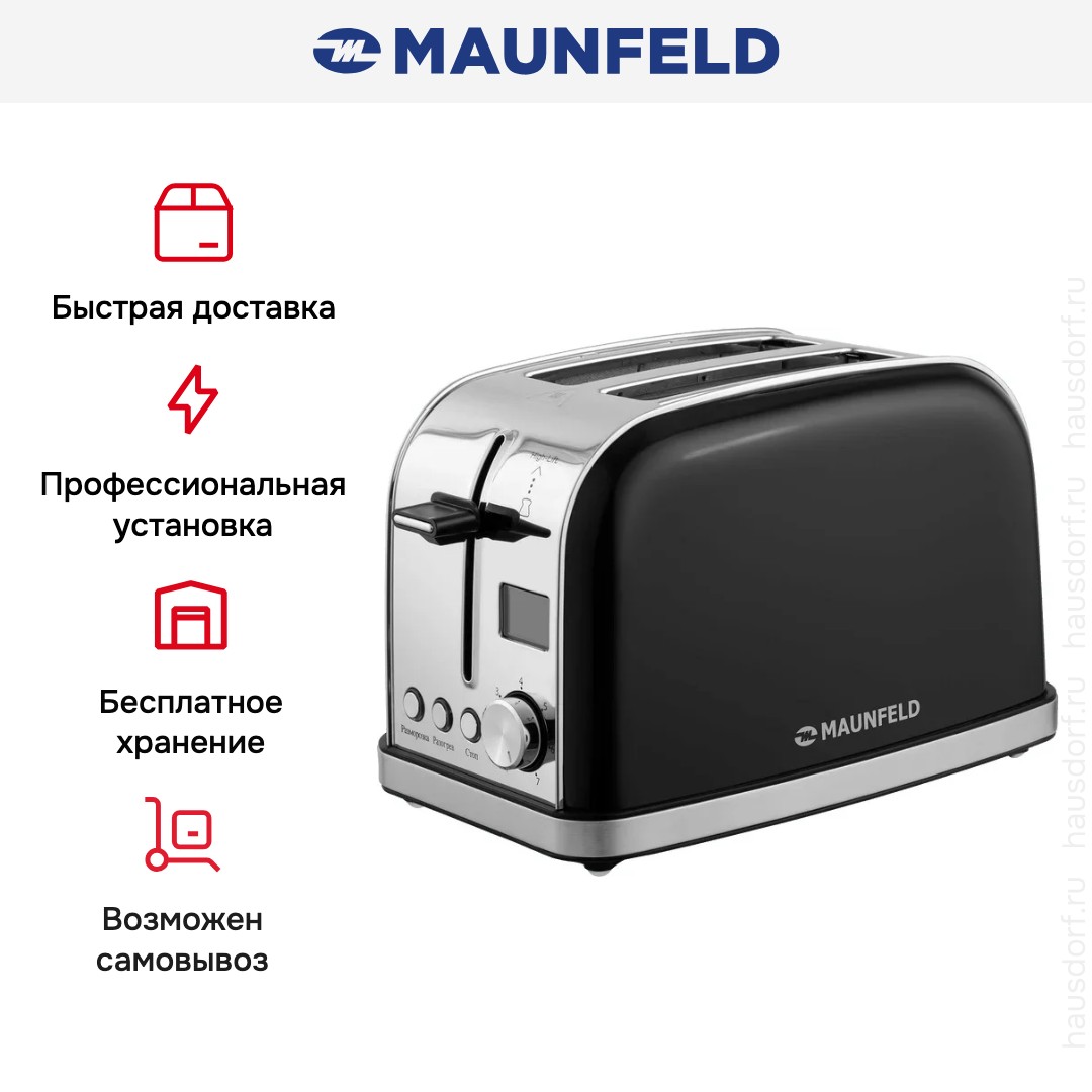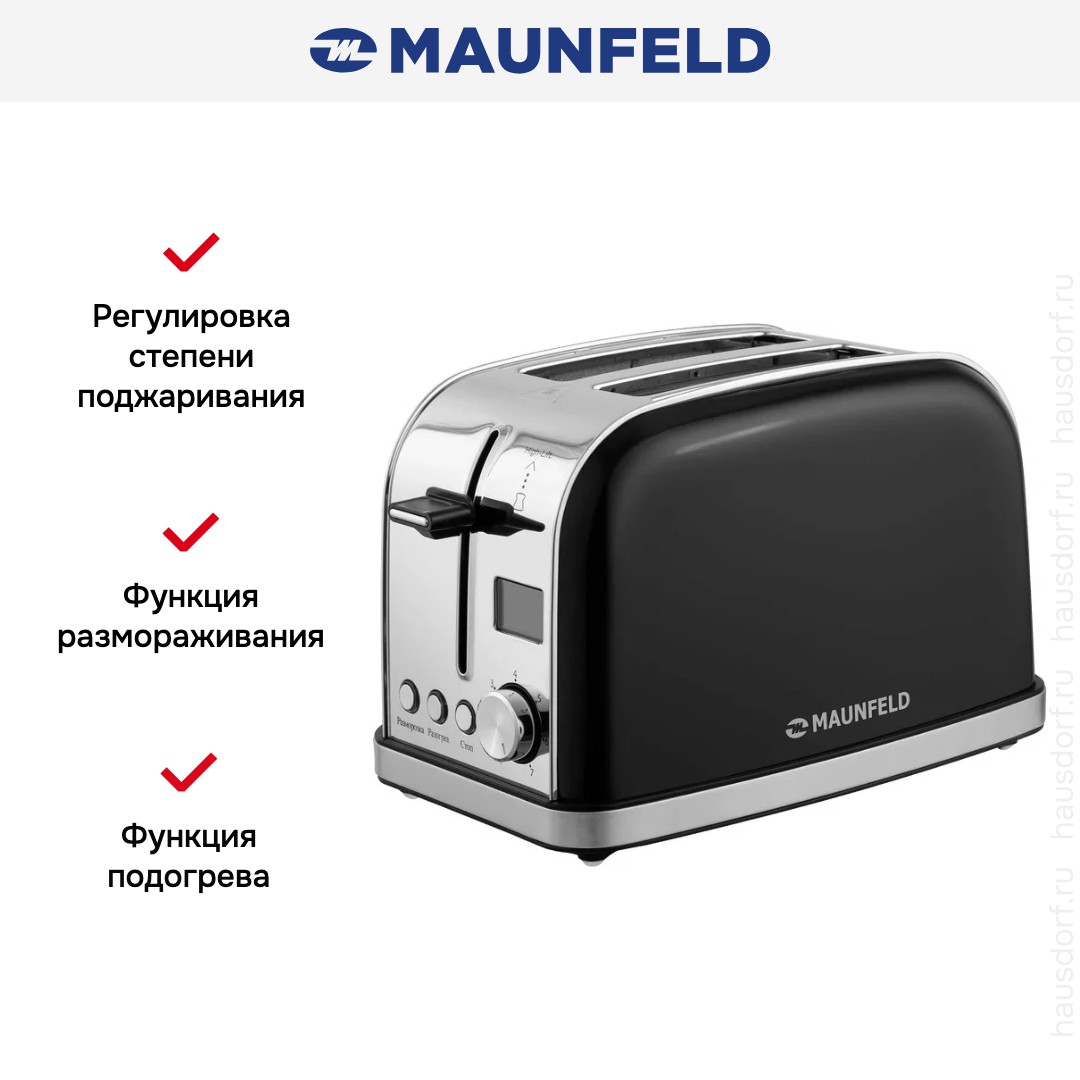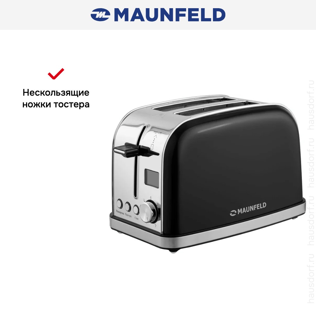 Стильный тостер Maunfeld имеет компактный корпус на устойчивых ножках, благодаря которым не пошатывается, даже если хлеб выпрыгивает вверх в конце приготовления. Основной материал, из которого изготовлен прибор, — нержавеющая сталь. Его главный оттенок — черный. Простое и понятное механическое управление позволяет быстро разобраться во всех функциях. Простое и понятное электронное управление позволяет быстро разобраться во всех функциях. На корпусе расположены кнопочные+поворотные переключатели для изменения настроек. Благодаря небольшому дисплею еще удобнее следить за процессом.