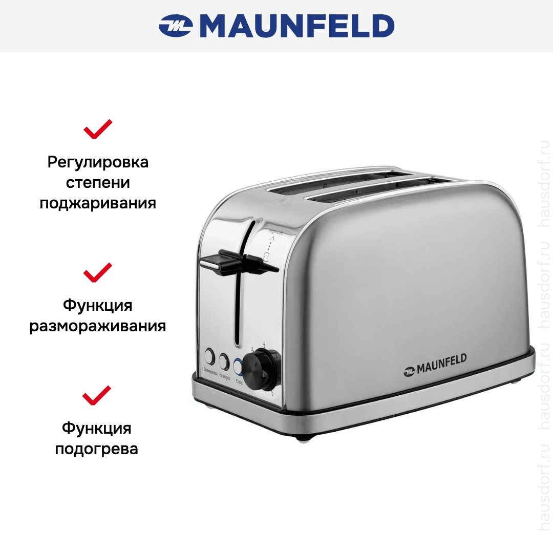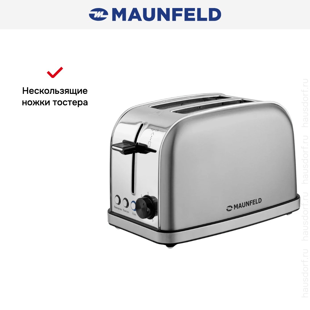 Стильный тостер Maunfeld имеет компактный корпус на устойчивых ножках, благодаря которым не пошатывается, даже если хлеб выпрыгивает вверх в конце приготовления. Основной материал, из которого изготовлен прибор, — нержавеющая сталь. Его главный оттенок — нержавеющая сталь. Простое и понятное механическое управление позволяет быстро разобраться во всех функциях. Простое и понятное электронное управление позволяет быстро разобраться во всех функциях. На корпусе расположены кнопочные+поворотные переключатели для изменения настроек.