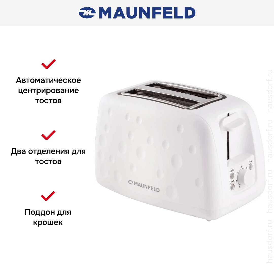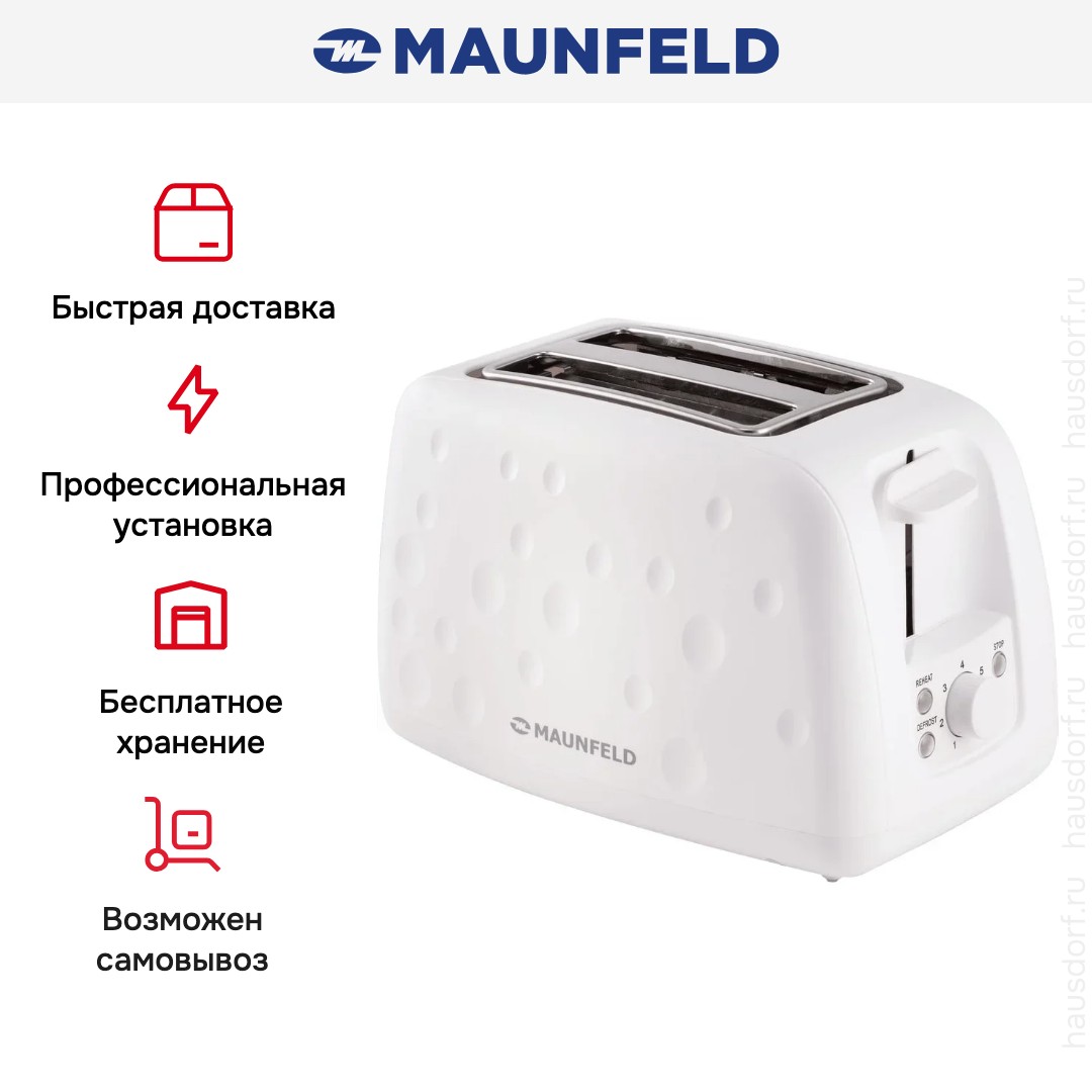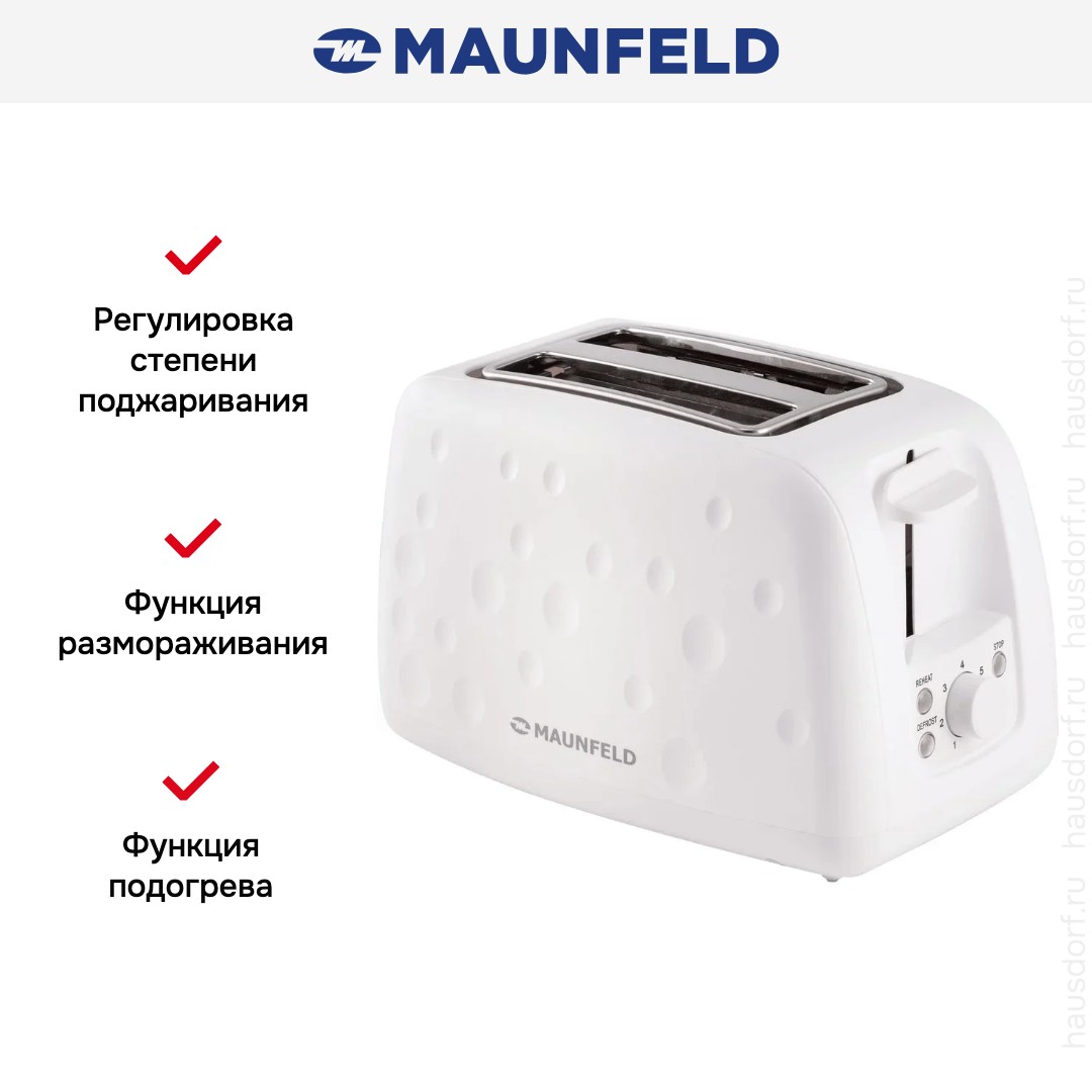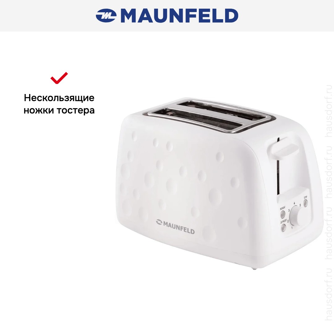 Стильный тостер Maunfeld имеет компактный корпус на устойчивых ножках, благодаря которым не пошатывается, даже если хлеб выпрыгивает вверх в конце приготовления. Основной материал, из которого изготовлен прибор, — пластик/ сталь. Его главный оттенок — белый. Простое и понятное механическое управление позволяет быстро разобраться во всех функциях. Простое и понятное электронное управление позволяет быстро разобраться во всех функциях. На корпусе расположены кнопочные+поворотные переключатели для изменения настроек.