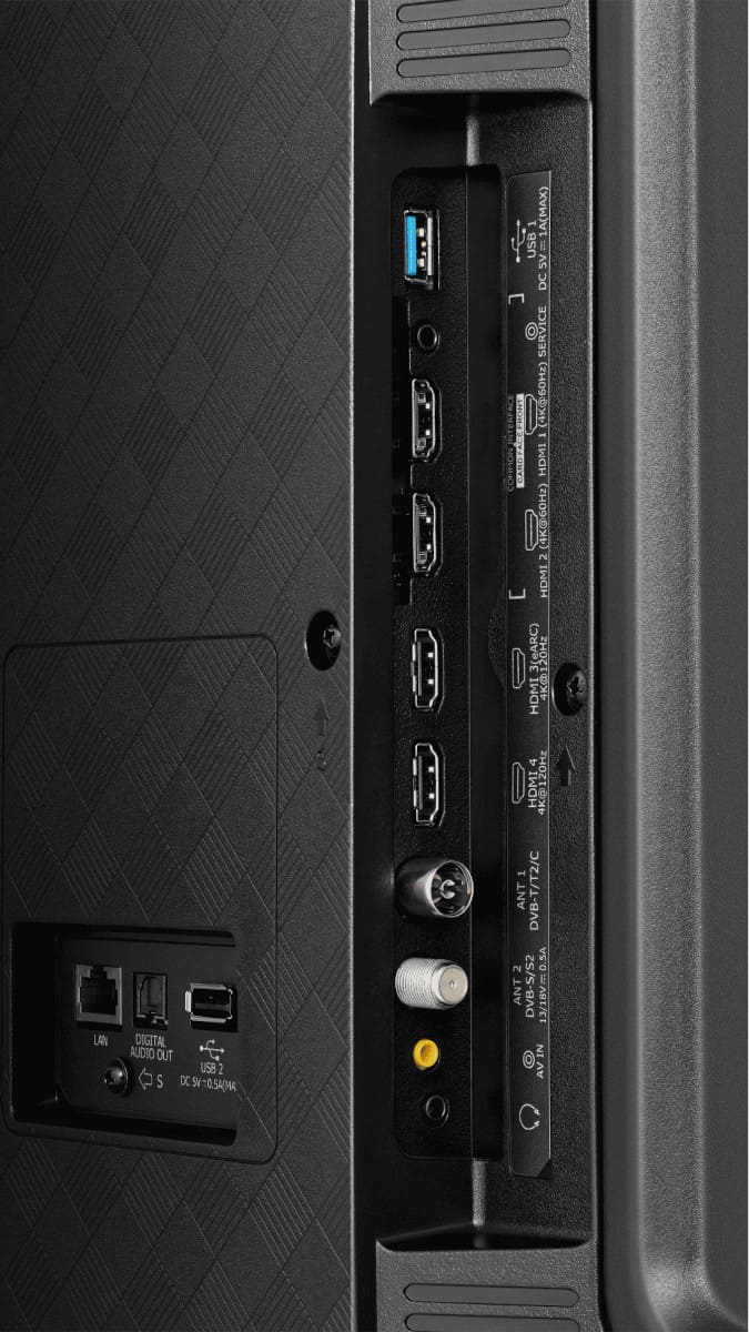 Звуковая система 2.1 с выделенным сабвуфером даёт объёмное звучание при просмотре фильмов и передач. Декодирование Dolby Atmos и DTS Virtual:X создаёт эффект трёхмерного звукового поля, а автоматическое выравнивание громкости убирает резкие перепады при рекламе. Набор аудионастроек включает пользовательский эквалайзер и фирменную обработку Dolby MS12AC-4, что позволяет адаптировать звук под тип контента и акустику помещения.