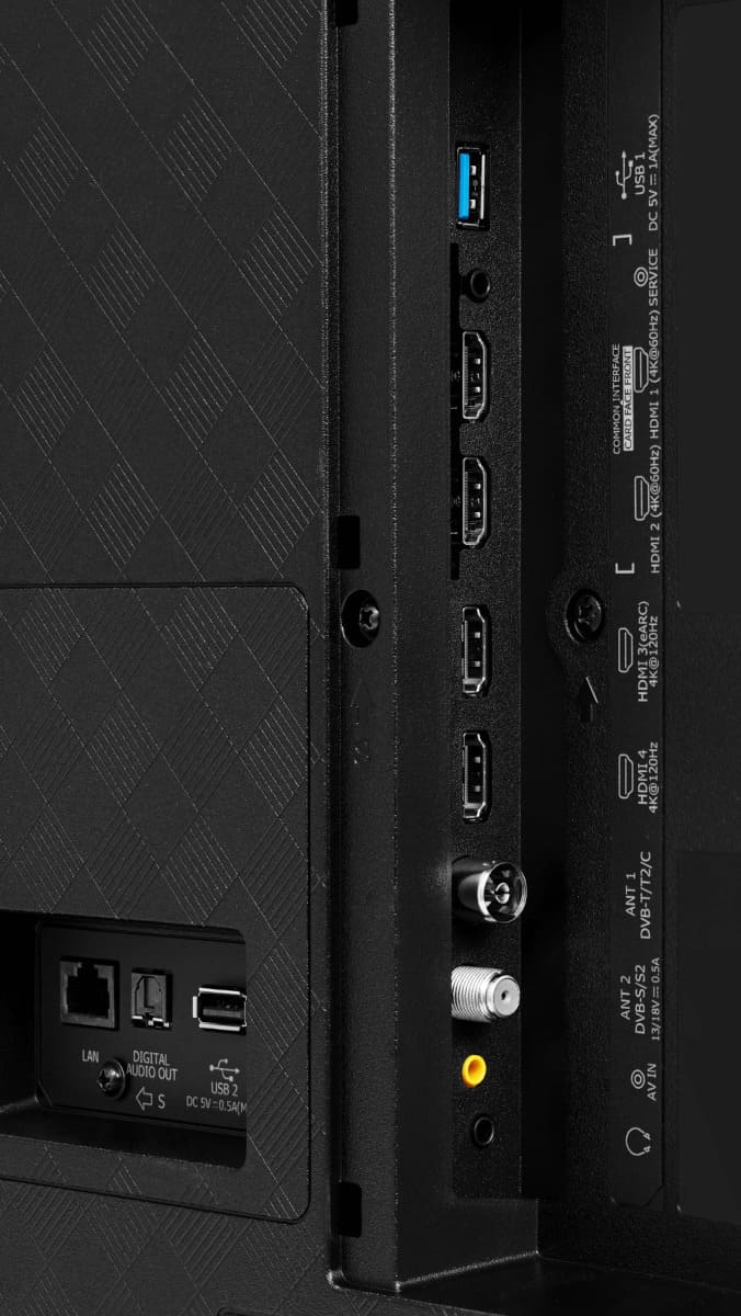 Порты спроектированы с расчётом на многозадачность: четыре HDMI, два USB, Ethernet и CI‑слот. HDMI с ARC и оптический выход поддерживают современные AV‑конфигурации без лишних адаптеров. Два входа для антенны и набор цифровых тюнеров DVB‑T/T2/C/S/S2 дают универсальность при приёме ТВ. Игровые режимы FreeSync Premium, VRR 48-120 Гц и ALLM обеспечивают плавность и минимальную задержку. Функции таймера сна, датчика освещённости и родительской блокировки добавляют комфорта в ежедневной эксплуатации.