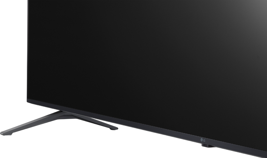 Дизайн выполнен в строгом черном цвете с тонкими рамками, которые не отвлекают от контента. Корпус плоский, глубина всего 5,75 см без подставки, поэтому аппарат легко впишется в современную гостиную или рабочую зону. На стену можно повесить панель по стандарту VESA 300×300, а в комплекте вы получите подставку, пульт и сетевой кабель.