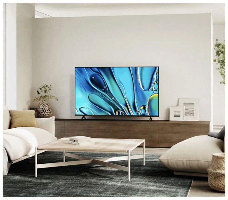 Компактные рамки и тонкий профиль корпуса придают устройству элегантный и современный вид, позволяя ему органично вписываться в интерьеры разного стиля — от классических до урбанистических. Благодаря универсальным габаритам телевизор легко размещается как на настенном кронштейне, так и на напольной подставке, не занимая много места.