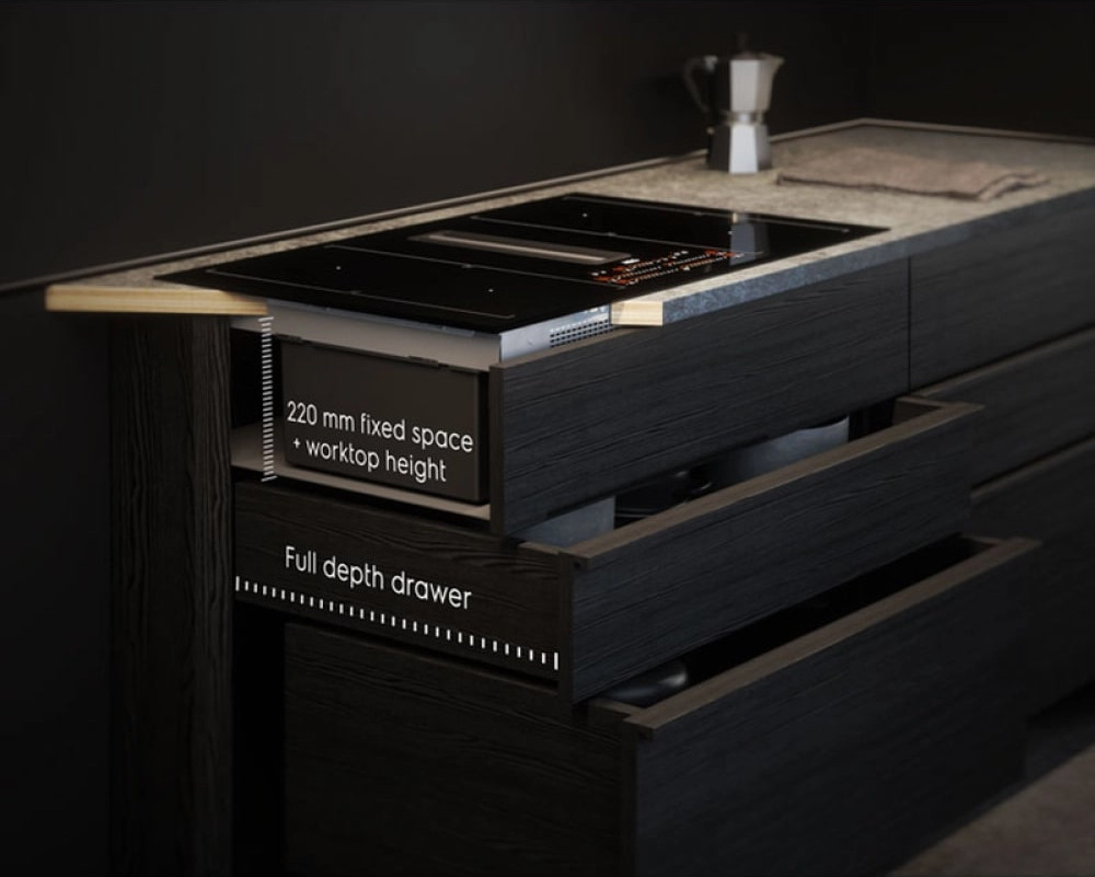 Вытяжка, встроенная в варочную панель — достаточно удобный вариант, позволяющий сэкономить место в кухне. Такая конструкция позволяет лучше улавливать испарения, не давая им распространяться по всему помещению, и способствует более качественной очистке воздуха. Большинство подобных моделей может работать только в режиме рециркуляции воздуха, с удалением капель жира, сажи, неприятных запахов при помощи системы фильтров. Работу в режиме отвода загрязненного воздуха через систему вентиляции организовать довольно сложно, поскольку вытяжка располагается низко над полом. Часто варочная панель находится на кухонном острове, что также мешает присоединению к вентиляции. Еще одна особенность подобных моделей состоит в том, что под варочной панелью нельзя разместить духовку или другую технику, так как место будет занято.