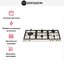 Варочная панель в дизайне слоновой кости с фурнитурой в цвете «хром». На поверхности расположено 5 латунных конфорок разного диаметра. Крупная конфорка WOK находится слева, может набирать мощность до 5 кВт. Ручка управления этой зоной расположена отдельно. Поворотные переключатели установлены на фронтальном крае, вы можете включать газ одним нажатием благодаря функции автоподжига.