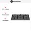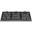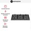Варочная панель в черном матовом дизайне с фурнитурой в цвете «хром». На поверхности расположено 5 латунных горелок разного диаметра, с мощностью от 0,48 до 5 кВт. Крупная конфорка WOK находится слева, ручка управления ею также вынесена отдельно. Все переключатели на переднем крае, вы можете включать газ одним нажатием благодаря функции автоподжига.
