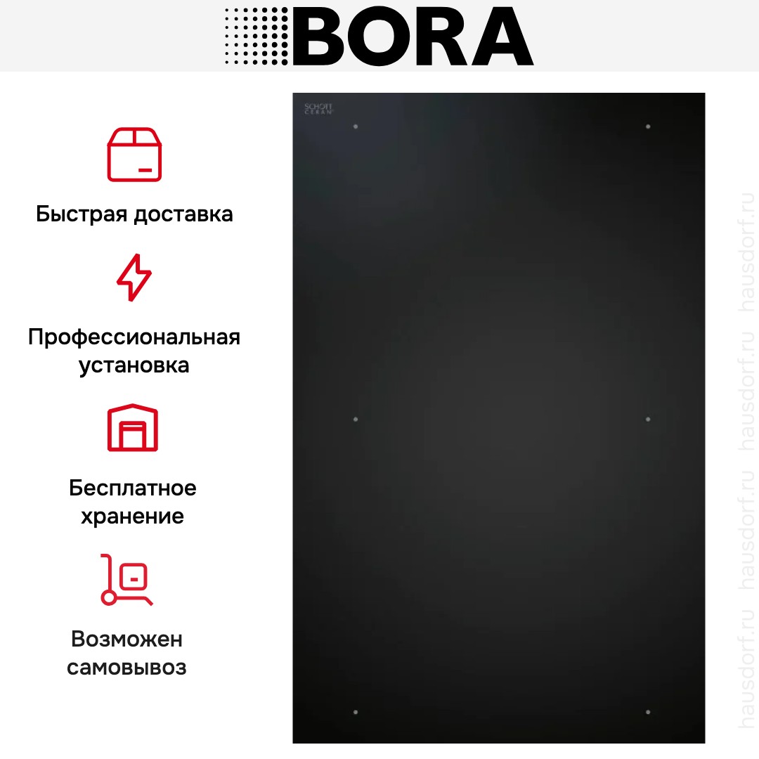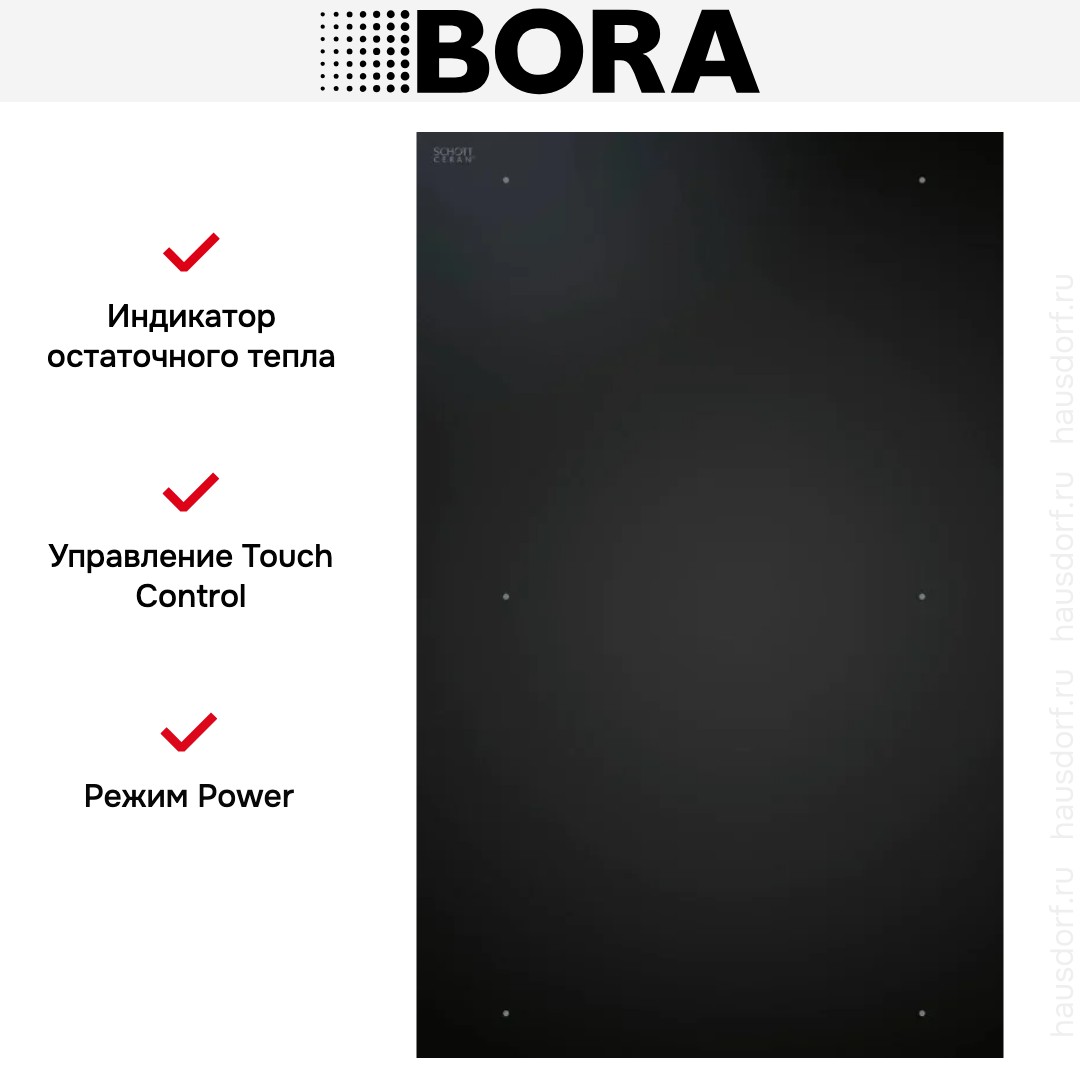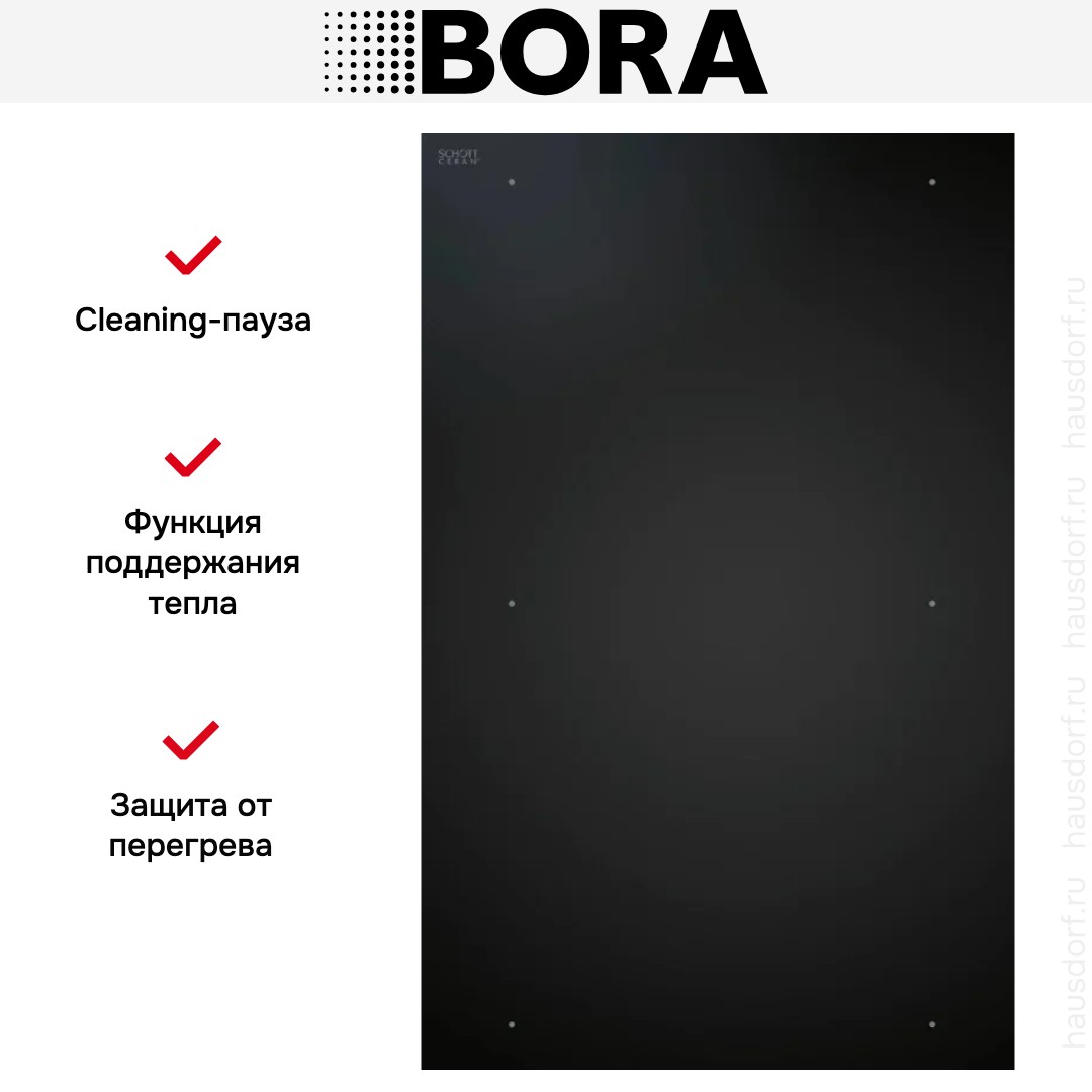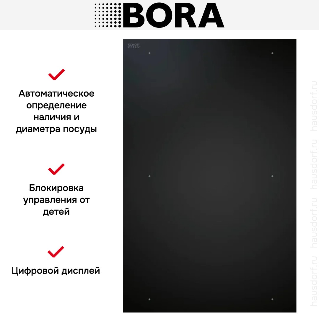 Модель БОРА CKFI входит в дизайн-линейку: Classic 2.0. Цвет — черный. Благодаря отсутствию рамки она отлично впишется в интерьер и не займет лишнее место на столешнице, которое можно использовать для работы. Материал самой поверхности: стеклокерамика. Управление этой моделью электронное. Для переключения уровней нагрева, выбора функций используются следующие переключатели: сенсорные/TouchControl. Продвинутая система контроля за прибором делают его современным и отвечающим на главные запросы покупателя.