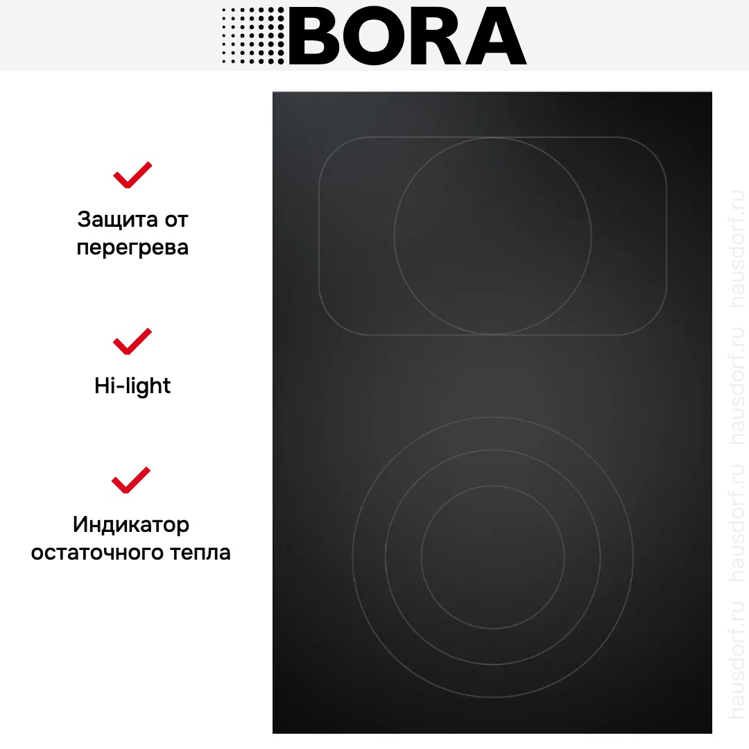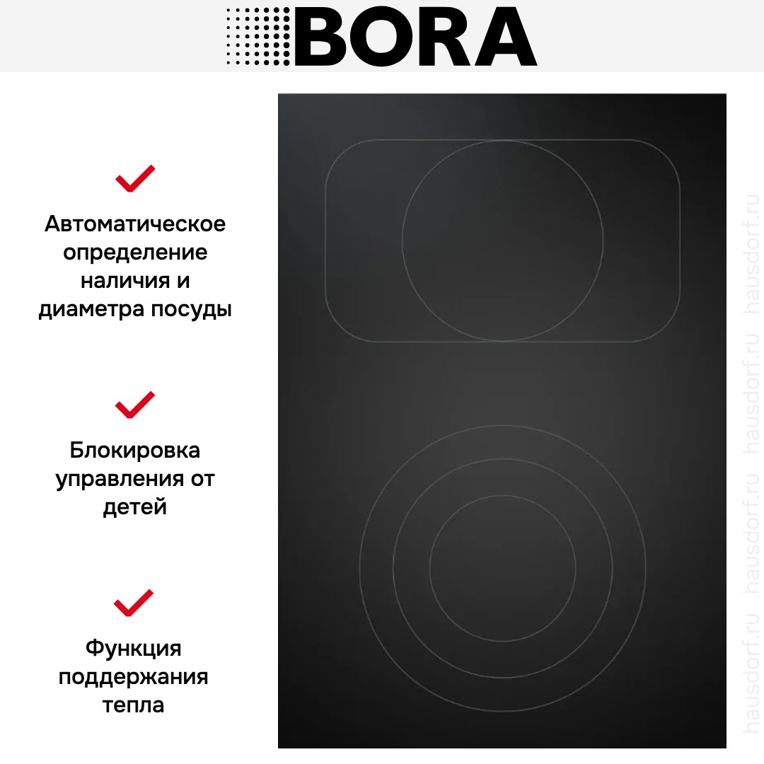 Варочная панель BORA PKCB3 — независимая накладная электрическая модель с черной поверхностью без рамки и серебристой фурнитурой. Высококачественное стеклокерамическое покрытие обеспечивает устойчивость к нагреву, сколам и механическим нагрузкам. За счет гладкой поверхности пролитую жидкость и жир можно удалить за пару движений.