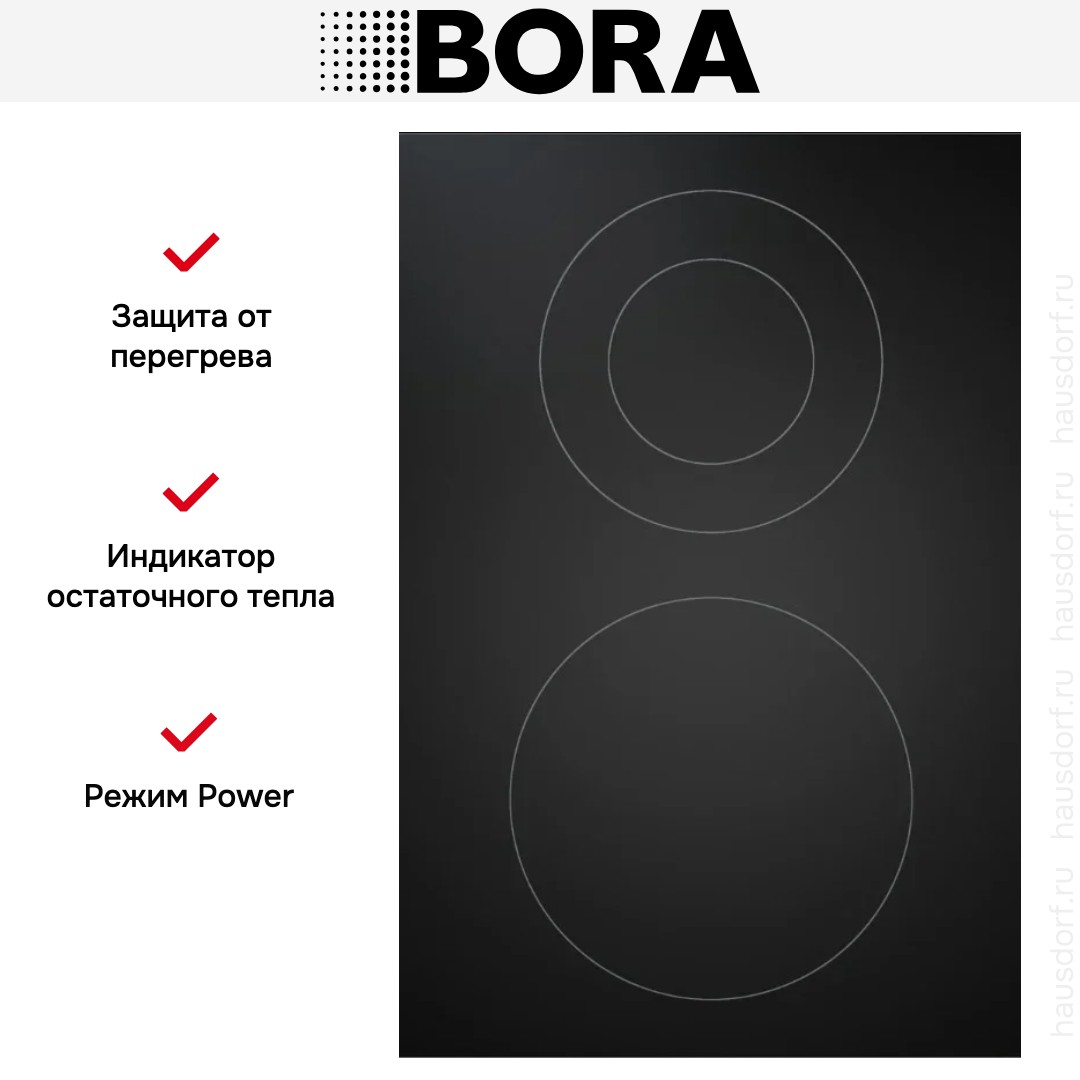 Модель БОРА PKCH3 входит в дизайн-линейку: Professional 3.0 Hyper. Цвет — черный. Благодаря отсутствию рамки она отлично впишется в интерьер и не займет лишнее место на столешнице, которое можно использовать для работы. Материал самой поверхности: стеклокерамика. Управление этой моделью электронное. Для переключения уровней нагрева, выбора функций используются следующие переключатели: поворотные. Продвинутая система контроля за прибором делают его современным и отвечающим на главные запросы покупателя.
