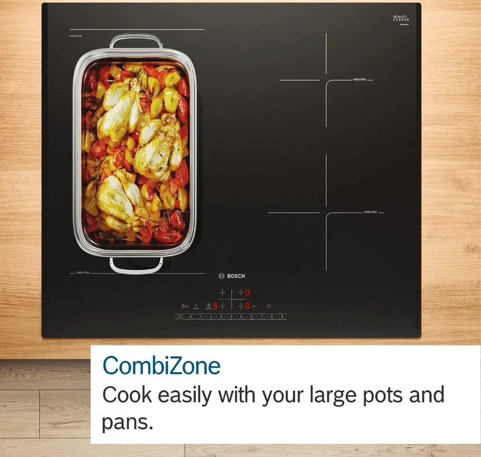 Индукционная варочная панель Bosch PVQ631HC1E — это современное решение для тех, кто ценит скорость, точность и эстетику на кухне. Модель оснащена тремя зонами нагрева, включая одну с функцией PowerFlex, позволяющей объединять две конфорки в единую увеличенную область — идеальную для посуды нестандартной формы, грилей или воков. Благодаря технологии индукции энергия направляется исключительно в днище совместимой посуды, тогда как сама поверхность остаётся почти холодной, что повышает безопасность, снижает энергозатраты и упрощает очистку.
