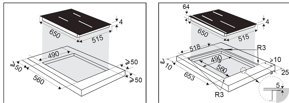 Варочные панели встраиваются в столешницу: они могут располагаться как заподлицо, так и выступать над ее поверхностью. Особенности их расположения зависят от высоты (толщины) варочной панели, а та определяется, как правило, видом нагрева, материалом поверхности и типом подключения — зависимым или независимым.