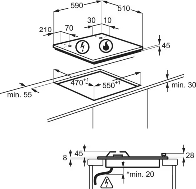 Глубина варочной панели представляет собой расстояние от ближайшей к пользователю ее точки до самой дальней. В первую очередь глубина определяется соответствующими размерами столешницы, куда варочная панель будет встроена, и уже во вторую — количеством и расположением конфорок.