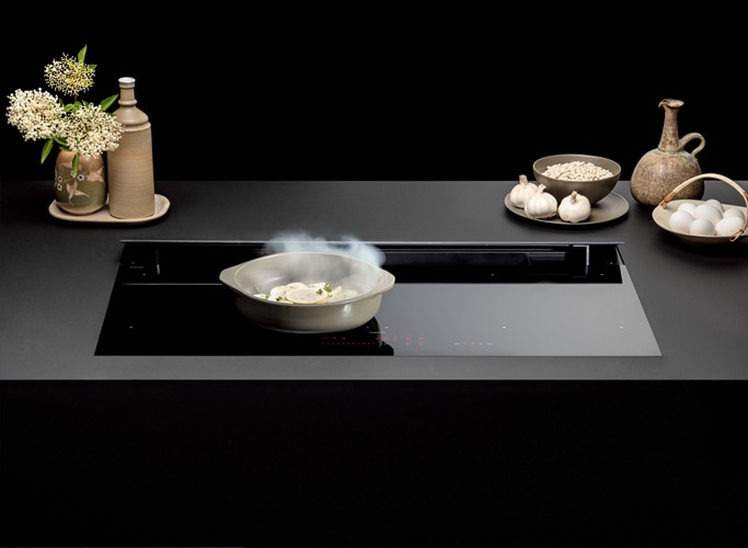 Вытяжка, встроенная в варочную панель — достаточно удобный вариант, позволяющий сэкономить место в кухне. Такая конструкция позволяет лучше улавливать испарения, не давая им распространяться по всему помещению, и способствует более качественной очистке воздуха. Большинство подобных моделей может работать только в режиме рециркуляции воздуха, с удалением капель жира, сажи, неприятных запахов при помощи системы фильтров. Работу в режиме отвода загрязненного воздуха через систему вентиляции организовать довольно сложно, поскольку вытяжка располагается низко над полом. Часто варочная панель находится на кухонном острове, что также мешает присоединению к вентиляции. Еще одна особенность подобных моделей состоит в том, что под варочной панелью нельзя разместить духовку или другую технику, так как место будет занято.