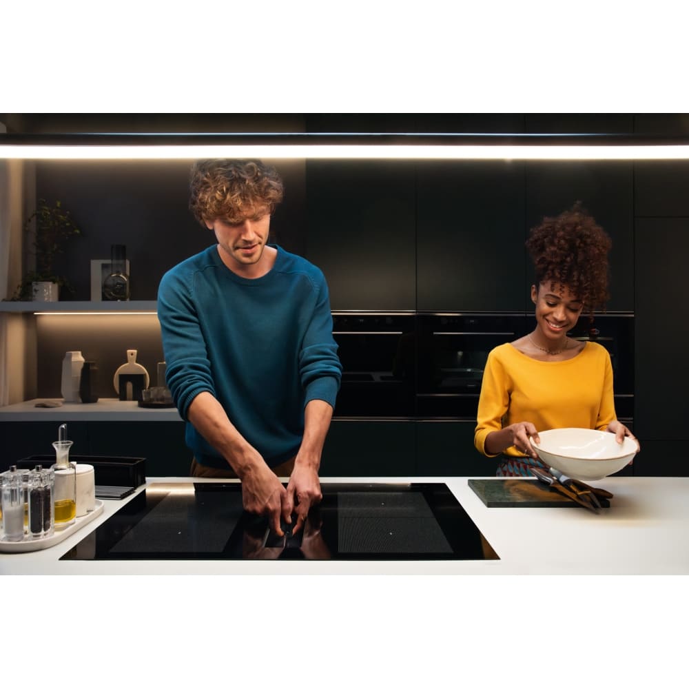 Выглядит сдержанно и монолитно: стеклянная рабочая поверхность черного цвета с прямым краем и стилистикой Mythos. Ширина 83 см и толщина корпуса создают впечатление компактного модуля, который устанавливается накладным способом и аккуратно занимает нишу 75×49 см. Фронтальное расположение элементов управления делает доступ к сенсорному слайдеру максимально удобным в повседневной готовке.