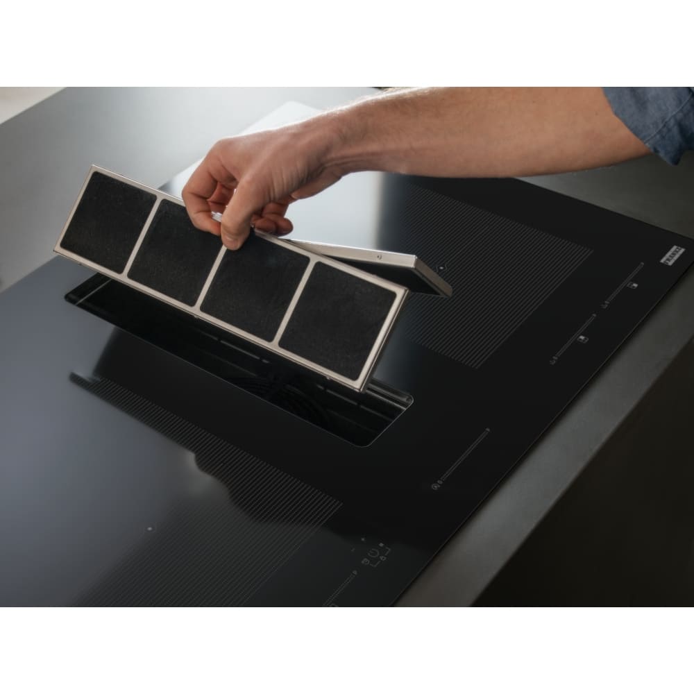 Вытяжка, встроенная в варочную панель — достаточно удобный вариант, позволяющий сэкономить место в кухне. Такая конструкция позволяет лучше улавливать испарения, не давая им распространяться по всему помещению, и способствует более качественной очистке воздуха. Большинство подобных моделей может работать только в режиме рециркуляции воздуха, с удалением капель жира, сажи, неприятных запахов при помощи системы фильтров. Работу в режиме отвода загрязненного воздуха через систему вентиляции организовать довольно сложно, поскольку вытяжка располагается низко над полом. Часто варочная панель находится на кухонном острове, что также мешает присоединению к вентиляции. Еще одна особенность подобных моделей состоит в том, что под варочной панелью нельзя разместить духовку или другую технику, так как место будет занято.