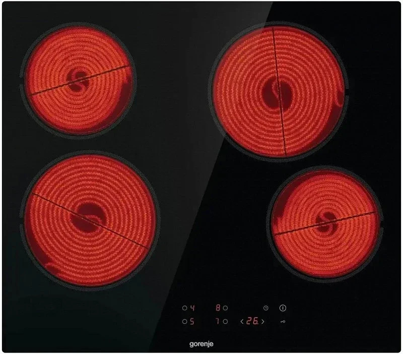 Четыре Hi‑Light зоны обеспечивают стабильный и равномерный нагрев благодаря скрытым электрическим ТЭНам под стеклокерамикой. Диаметры и мощности зон рассчитаны на разные задачи: две большие зоны 200 мм мощностью по 1.8 кВт подойдут для кастрюль и сотейников, а две малые 165 мм и по 1.2 кВт — для соусов и небольших посудин. Такая конфигурация дает гибкость при готовке и позволяет одновременно использовать как большие, так и компактные емкости. Стеклокерамика устойчива к высоким температурам и тепловому удару, но требует аккуратного обращения с тяжелой посудой, чтобы избежать сколов.