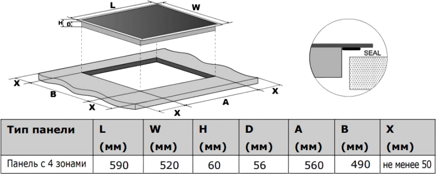 Это независимая индукционная поверхность шириной 59 см, соответствующая стандартным габаритам кухонных модулей. Для встраивания требуется ниша размером 56×49 см, а минимальная высота корпуса — всего 6 см — обеспечивает плотную и аккуратную интеграцию в столешницу. Благодаря индукционной технологии нагрев происходит мгновенно и исключительно в нижней части совместимой посуды, что повышает энергоэффективность, сокращает время приготовления и гарантирует безопасность: стеклокерамика за пределами активной зоны остаётся относительно прохладной.