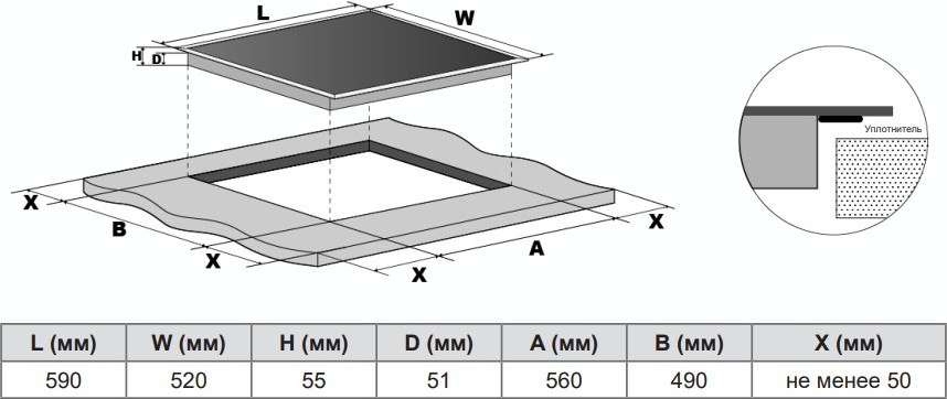 Глубина варочной панели представляет собой расстояние от ближайшей к пользователю ее точки до самой дальней. В первую очередь глубина определяется соответствующими размерами столешницы, куда варочная панель будет встроена, и уже во вторую — количеством и расположением конфорок.